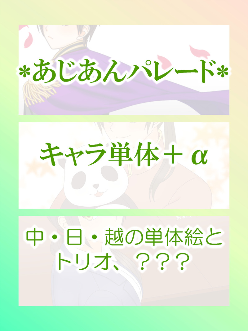ymym601☆こそフォロ過去のを晒すあじあんパレード!WEB 通開催おめでとうございます!こちらはにーに・祖国・越っちゃんの単体絵とトリオ、???になります。CP要素は無しです。 すべて表示(+8枚) タップで全画面(原寸:1498x2000)無断転載禁止 リアクションをたくさん送って応援しよう! よく使う人気おやつその他支払処理中 作者からのリプライ 気になる人をどんどんフォローしよう!☆こそフォロ ymym601過去のを晒すあじあんパレード!WEB 通開催おめでとうございます!こちらはにーに・祖国・越っちゃんの単体絵とトリオ、???になります。CP要素は無しです。 9 ymym601過去のを晒すあじあんパレード!WEB 通開催おめでとうございます!こちらは今まで描いたにーにと祖国の誕生日絵のまとめになります。絵は古い順に並んでいます。 28 ymym601過去のを晒すあじあんパレード!WEB 通開催おめでとうございます!こちらはにょたりあのねーねと桜ちゃんの絵になります。(CP要素のある絵と無い絵が混在しています)絵は古い順に並んでいます。 6 ymym601過去のを晒すあじあんパレード!WEB 通開催おめでとうございます!こちらはにーにと祖国のCP絵になります。絵は古い順に並んでいます。 8 ymym601過去のを晒すあじあんパレード!WEB 通開催おめでとうございます!こちらはCP要素の無いにーにと祖国の絵になります。(1枚だけ2人以外のキャラも入った絵があります)絵は古い順に並んでいます。 14 ymym601過去のを晒すあじあんパレードWEBオンリー開催おめでとうございます!こちらは今まで描いたにーにと越っちゃんの誕生日絵のまとめになります。絵は古い順に並んでいます。 28 おすすめ作品 SAKURA作業進捗舐めたい JenMushroomらくがき叔佐鳴 多次拒绝卫生纸らくがき 5 ann21442117メモ《骨色珊瑚,皮肉珍珠》5 4 tabaらくがきシティ用漫画やっと全体像見えた…14ぺージ…こんなに枚数使うつもりなかったんだけど…とりあえず間に合いそうかな… すモモーヌ作業進捗ビエワグ本進捗。5月間に合うかな… しゅがーらできたローソンコラボ絵接客、案外「良い店員」を演じて評判良かったりすると自分得。元気キャラだけどちゃんと気遣いできるイメージがある。育ちが良いからか fumiかきかけ 🐕’s2aできたおめでとう!🎉👏