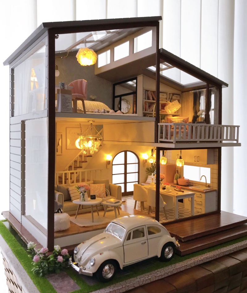 今回はクォータービューでなく3面が壁だったので細かい調整が大変だった。なお配線は本物の家と同じく壁紙や床材の下を這っている。最後は工事ばかりだった。