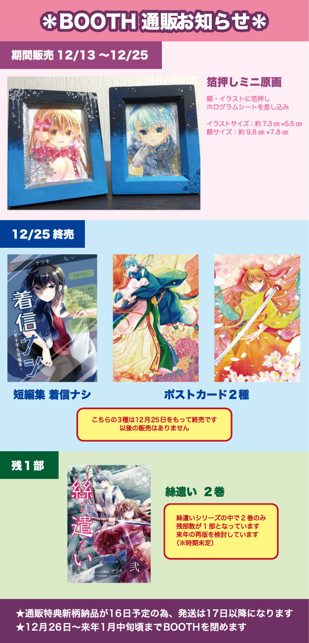 ・「短編集着信ナシ&ポストカード2種」は発行時期が古く残部数が微妙な為12/25で終売とします