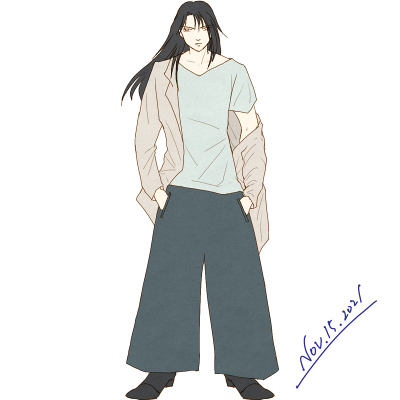 街中でフレアパンツ?履いてる男の子が居て、いいなぁと思ったので推しに着せた。普段着の推し、尊い!(両手で顔を覆いながら。