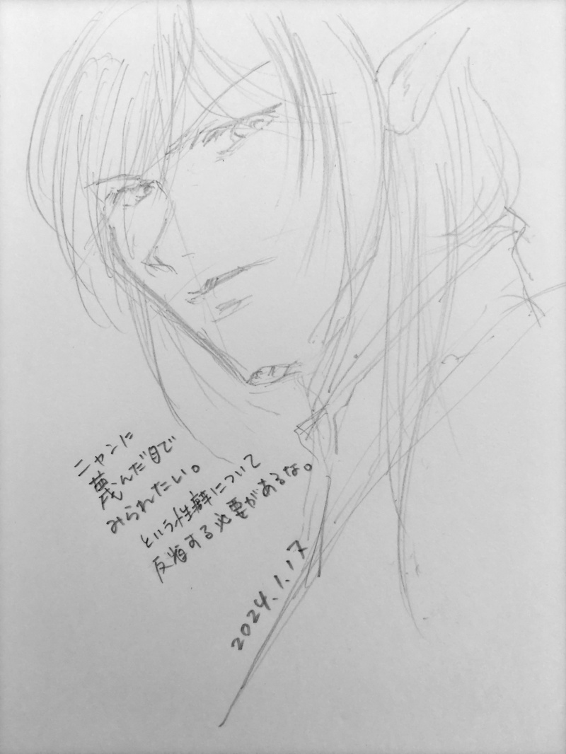 茜空@お絵描き修行中☆quiet followDOODLEニャン。足蹴にされたいとか思ってしまったので。メンテ明けのログイン800人待ちしながら描いた絵。また今回も「FCの人たちに見せ・・・やっぱ下手過ぎてダメ!」ってなってる。しゃーない。 Tap to full screen (size:1500x2000).Repost is prohibited Let's send reactions! freqpopularsnackothersPayment processing Replies from the creator Follow creator you care about!☆quiet follow 茜空@お絵描き修行中DOODLE自機をアクキー用にデフォルメで描いてる方がいて、めっちゃかわいいいいい!って思ったのでやってみた。・・・いろいろと足らないorz。技術も根性も。 2 茜空@お絵描き修行中DOODLE人間を二人描くのは無理です!とさんざん言ってきたのですが、推しと自機を絡ませるためなら何もかも乗り越えるんだぜ!とは言え。清書するにはバランスが悪い。要修正。てか清書すんの? どうやって?(画材がわからぬ。14がメンテ中なのでお絵かきしてしまったけれど、本当は字を書かねばならんのである。弱い人間である。 茜空@お絵描き修行中DOODLEFF14。ヴァルシャンがですね、唐突に成人体になってしまいまして!!!いやそんなん認められないよ、ショタが可愛かったのに、ショタヴァルシャンを返してよおぉおお!と叫んだんですが。いったん冷静になってみると、成人ヴァルシャンすげぇいいな!って。嫁にするわ!って思いました。(まぁ、スクショ撮る暇もないくらい目の前素通りされたんですけどねw。 茜空@お絵描き修行中DOODLEアゼム(うちの世界線の姿。こればっかりは、自分で描かないと画像化されないんですよ。肌が黒い設定なのでアナログでは再現できず、久々デジタル画。しかし色塗り苦手過ぎて、光源どこやねん!ってなってるw。 茜空@お絵描き修行中DOODLEファダニエル。左右のバランスが崩れてるんですが、顔立ちのシンプルさはこの方向性で良いと思うのだ。バランスは崩れてるけど。なんですぐ正面顔にトライしてしまうのか。アサヒは、そもそも顔は好きだったんですけど、やっぱ過去の来歴とか聞いちゃった途端に「うおぉ描きてぇ!!!」って溢れるエモーション。鉛筆描きを自動補正で濃くしたので、若干不自然です。 茜空@お絵描き修行中DOODLEニャン。足蹴にされたいとか思ってしまったので。メンテ明けのログイン800人待ちしながら描いた絵。また今回も「FCの人たちに見せ・・・やっぱ下手過ぎてダメ!」ってなってる。しゃーない。