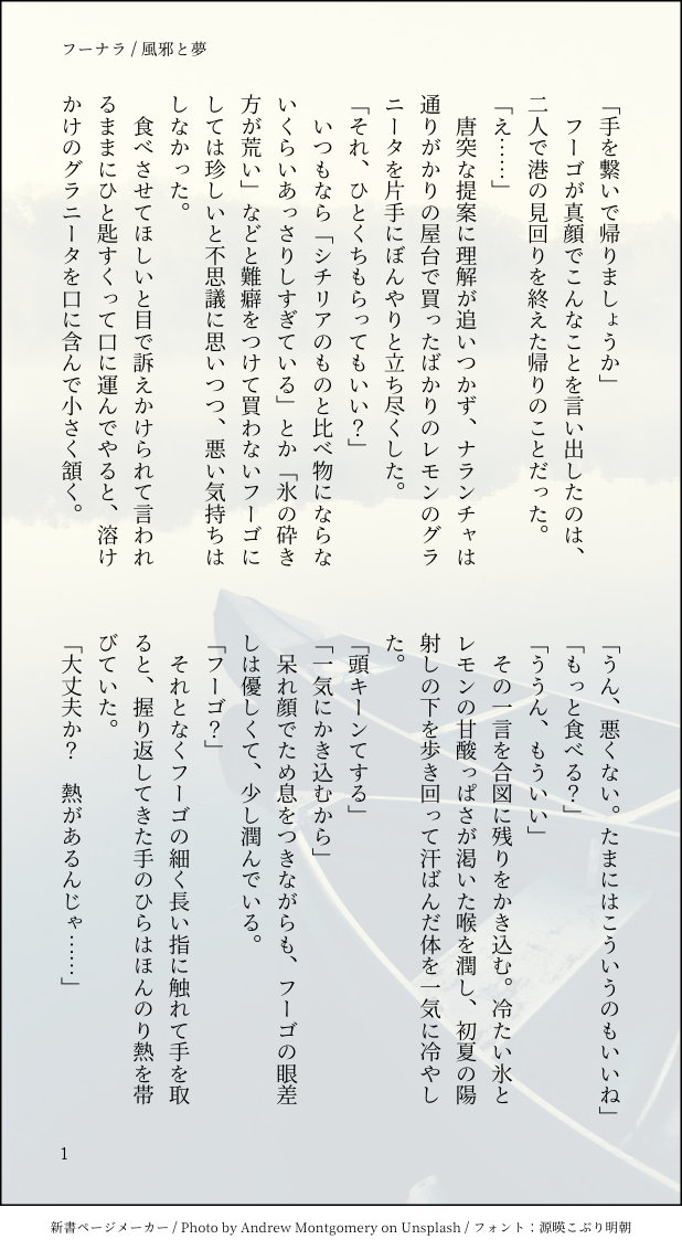 まみたに園☆silencio seguirGARABATEAR🍓🍊SS(全年齢※触れる程度のキス表現あります)平和時空の🍓🍊です。お付き合いしたてくらい。🍓が風邪をひいて🍊に少し甘えるほのぼの話です。なんでも許せる方向け。 mostrar todo(+6 imágenes) Toque para pantalla completa (tamaño:618x1132).Está prohibido volver a publicar ¡Mandemos reacciones! frecuenciapopularbocadillootrosProcesando pago Respuestas del creador ¡Sigue al creador que te importa!☆silencio seguir まみたに園HECHO推しカプのエッチについて語るシート(🔫🐞) まみたに園HECHO推しカプのエッチについて語るシート(フーナラ🍓🍊) まみたに園HECHOフーナラ🍓🍊SS(全年齢)夏の終わりにフーゴが無意識の寂寥感からナランチャの膝から離れなくなるほのぼの話。ナランチャ目線です。※スマホやロボット掃除機が登場します。なんでも許せる方向けです。 2330 まみたに園HECHOフーナラ🍓🍊SS(※R18)フロアランプの温かい光に包まれて肌を重ね合う2人の話です。 4189 まみたに園GARABATEARミスフー🔫🍓前提の🍓とNo.5のほのぼの会話です。恥パ後の新パの2人。🍓がNo.5にいたずらをします。体に悪いので良い子は真似しないでください。喫煙表現があります。🍓とピiスiトiルiズの会話が見たくて捏造してるのでなんでも許せる方向けです。※No.5のセリフをカタカナ言葉にしたら読みづらかったので漢字とひらがな表記にしてます。 3 まみたに園GARABATEAR🍓🍊SS(全年齢※触れる程度のキス表現あります)平和時空の🍓🍊です。お付き合いしたてくらい。🍓が風邪をひいて🍊に少し甘えるほのぼの話です。なんでも許せる方向け。 7