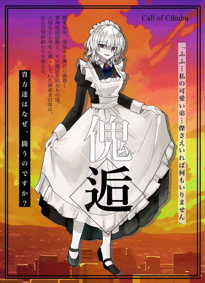 柚木@trpg☆quiet followDONECoC『邂逅』全生還にてシナリオ終了 #CoC #立ち絵 standingPicture #TRPG #邂逅 chanceMeeting show all(+4 images) Tap to full screen (size:3040x4181).Repost is prohibited Let's send reactions! freqpopularsnackothersPayment processing Replies from the creator Follow creator you care about!☆quiet follow 柚木@trpgINFOCoC『ASTRO CODA』KP だいしさんPL/PC1:bloom/セレナ・ミラーPL/HO2:柚木/桜田 恵利菜PL/HO3:くるすさん/九条 真昼エンドD:全ロスト 柚木@trpgDONECoC『ASTRO CODA』▽共通HO・心身ともに健康な20歳以上である。・ミッションに参加する意志がある。・■■■■■■■■■■■。はなひらり継続探索者 6 柚木@trpgDONECoC『ツインレイの悲劇』HO Professr:ヴィクター・フォン・プロフェンスキー 6 柚木@trpgINFOCoC 『ツインレイの悲劇』KP:bloomPL/PCHO Detectiveくるすさん/アリア・H・ウィリアムズHO Professr柚木/ヴィクター・フォン・プロフェンスキーエンドAにてシナリオ終幕 2 柚木@trpgINFOCoC『怪異でごめんなさい』KP/KPC:モチャさん / 魔女PL/PC :柚木 / 狼かいマホ継続エンド6にてシナリオクリア 柚木@trpgDONE夏に逃げ水描いたスチルです。ネタバレを含みますのでご注意ください 5 related works lala_kuronoDONECoC【ゆれるフリルにくちづけて】ロトカ・ヴォルテラの愛堕討ち継続:大賀美 唯2枚目:表情差分まとめ※チョット受っぽい差分もある(Pass:ok) 2 amadare_2DONE立ち絵まとめ 37 ちゃんすけDONEエマニュエル・・・・・・・(山羊歌各話ネタバレ) 25 ちゃんすけDONEしぶき~~~~~の立ち絵 49_trpgDONEてみふろHO4の差分を作ってみたよ 現行未履修× パスは49 いちおかしDONE織春 結(22) 新米ホスト立ち絵差分並べると、アハ体験みが強すぎて笑ってしまう。 いちおかしDONE白骨幸子(小学生)ぼくみご参加したぞー!動物が大好きな女の子。 ちゃんすけDONE壬弥川 恭介(みやがわ・きょうすけ) 32歳メカニック。不真面目の擬人化。ノリが軽く飄々とした性格。普段から刑事らしからぬ格好をしているので上司から別部屋で指導が入ったり入らなかったりするけど結局聞いてない。愛用のタバコはピース。赤面差分多いのはサルーテのせいです。 23 ちゃんすけDONE鳴海 朔 26歳 バーテンダー 8 recommended works よ擬ぎDOODLE虞美人さん ハネ。DONE王の器4で配布した無配です(●︎´▽︎`●︎) 4 後藤DOODLE色々試し中です もみじDONEヘッダー用に描いてたアマデウス(梅雨) meeresDOODLE大昔に買った限られた数のコピックではこれが限界でした… 漬物くんMAIKING新シンくん さいがゆのDOODLE女装注意 3 月見里 @kr3166DOODLE色替え狂化させて遊んだ yoakeryuyaPAST嘆くアマサリ