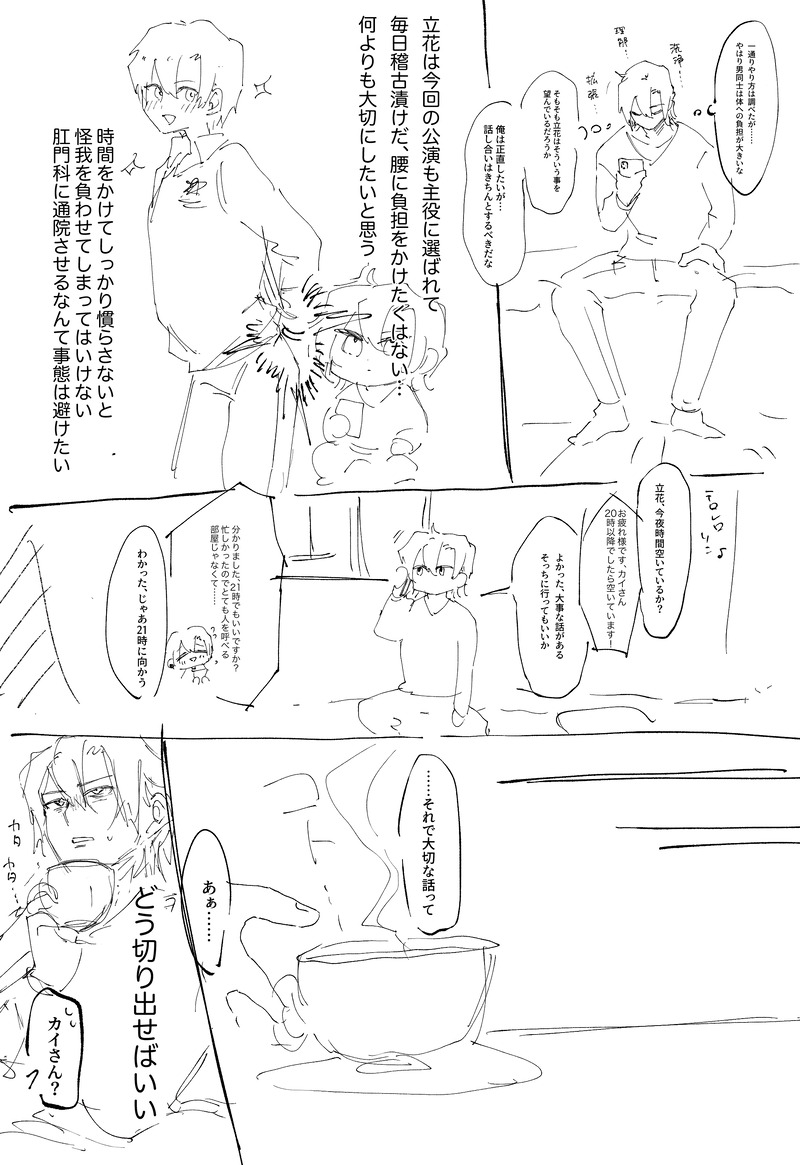 カイさん、立花が男でも対応変わらなかったのが良いよねと言う話を3年前に友達としていて、男同士のアレコレを真剣に調べるカイさんの可能性のリズムで盛り上がってたんですけど