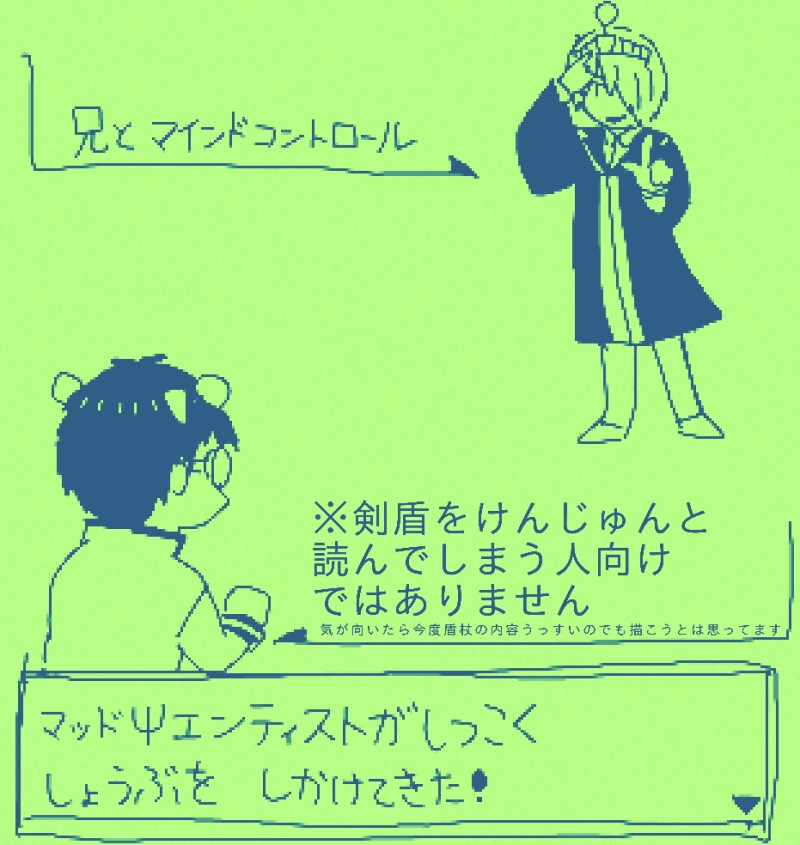 ネタ要素に初代画面風の色味にしてみたけどよく考えたらポケットでやっと買ってもらえた世代だしなんならスーパーGB2でやってたしあの色合いには馴染みが無いんだよなと無駄な事を思う。