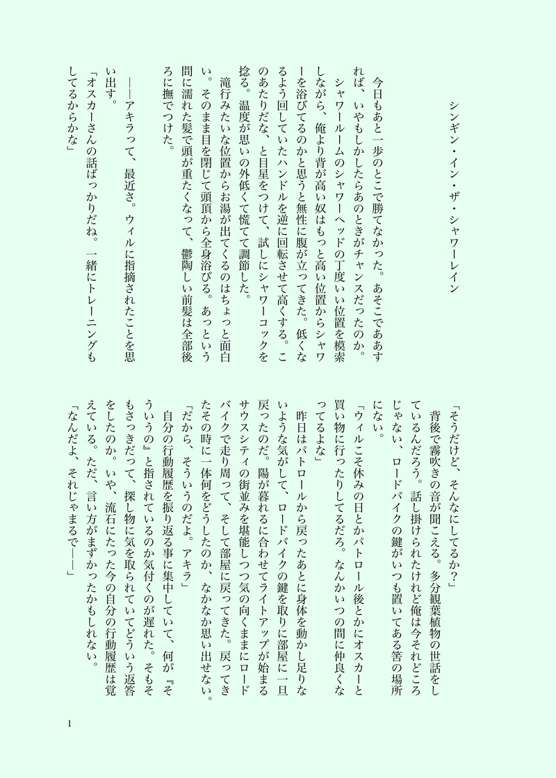 佳芙司(kafukafuji)☆quiet followMOURNINGシャワールームのオスアキ #オスアキ show all(+3 images) Tap to full screen (size:2125x2976).Repost is prohibited Let's send reactions! freqpopularsnackothersPayment processing Replies from the creator Follow creator you care about!☆quiet follow 佳芙司(kafukafuji)MOURNING下戸の見た幻覚から生じた虚無。二人きりの夜に酒飲んでる話。【パス:三次元のそういうやつアルファベット4文字、無敵№、天才最初期№】 8953 佳芙司(kafukafuji)SPUR ME存在しない幻覚による存在しない男が文句を言いつつ先輩の言いなりに仕事する話。【パス:三次元のそういうやつをアルファベット4文字】 2549 佳芙司(kafukafuji)SPUR ME存在しない幻覚による存在しない男達の不穏な雰囲気のランチタイムの話。【パス:三次元のそういうやつをアルファベット4文字】 2445 佳芙司(kafukafuji)DOODLE存在しない幻覚による存在しない事件の翌日、存在しない愉快な仲間たちの話。【パス:三次元のそういうやつをアルファベット4文字】 2913 佳芙司(kafukafuji)TRAINING存在しない記憶と幻覚の交差する路地裏の話。【パス:三次元のそういうやつをアルファベット4文字】 2474 佳芙司(kafukafuji)DONE存在しない幻覚による存在しない事件の、存在しない関係性の幻覚の後編話。【パス:三次元のそういうやつをアルファベット4文字】 9019 related works 佳芙司(kafukafuji)MOURNING前にピクシブに投稿してたやつ 1708 bossccoDONEまだくっついてないオスアキ 708 yurina_sDONE熱烈!炎のクッキング!7/10続きです~ 3 佳芙司(kafukafuji)PROGRESSルーキー研修が終わった6年後という設定のパラレルワールドというか近未来パロディというかなんかそういうラブコメ話になる予定の冒頭部分。 1443 佳芙司(kafukafuji)MOURNING前にピクシブに投稿してたやつ。20201212 1491 佳芙司(kafukafuji)DONE本当は本にしたかったけど書く気力を失った「ホテルで初夜に臨むオスアキ」の本文の方 6 yurina_sDONE4/10(枚数)サウスでアキラカワイイカワイイしてます 4 bossccoMAIKING途中まで 2841 佳芙司(kafukafuji)MOURNINGシャワールームのオスアキ 4 recommended works kimikohouseTRAINING与×ヤエル+按護のドリーム3Pすけべ落書き ときねDONEフリートの短文です。陣章ともキスブラとも取れたやつです。 2 佳芙司(kafukafuji)MOURNING前にピクシブに投稿してたやつ 1817 佳芙司(kafukafuji)MOURNING前にピクシブに投稿してたやつ 1708 佳芙司(kafukafuji)MOURNING親友が死んだと思ってるキース×親友が死んでない事を伝えてないブラッドのキスブラが一番好きだなと思いながら書いてピクシブに上げてたやつ。 3 佳芙司(kafukafuji)MOURNING無人島イベ後に狂って書いたオスアキ 4 佳芙司(kafukafuji)INFO【https://poipiku.com/3176962/5898028.html】の増量完結編。●全文公開先はこちら→https://pictbland.net/items/detail/1649996 995 ohoshiotsukiMAIKING死神ネタでなんか書きたい…と思ってたらだいぶ時間が経っていまして…途中で何を書いているんだ…?って100回くらいなった。何でも許せる方向け。モブ?がめちゃくちゃ喋る。話的に続かないと許されないけど続き書けなかったら許してください(前科あり)いやそっちもこれから頑張る(多分)カプ要素薄くない?いやこれからだからということでちゃんと続き書いてね未来の私…(キャプションだとめちゃくちゃ喋る) 3630 佳芙司(kafukafuji)TRAININGエマ視点→【https://poipiku.com/3176962/6268101.html】『Let’s take the long way home sometimes.』 2604