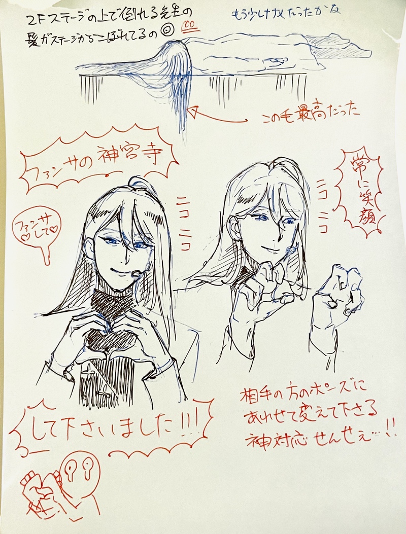 ステの雑な殴り描き感想絵です。ホテルのメモ帳に描き殴るくらいだったらiPad持ってくればよかった😭いでぽさんももっと描きたいけどダンスの時の動きが描きたくて…配信観たい…とりあえず日替わりの「降り注げ酸性雨!!」が最高でしたしダンスの時の動きが挙動不審とカッコ良さの狭間を感じる手足の動き凄かったです。そしていつも通り荒木さんの立ち姿のシルエットが完璧な「美」だったのですが、理由がわかりました…