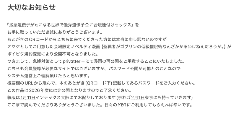 1月2日更新⚠️【劣悪遺伝子がαになる世界で優秀遺伝子Ωに合法種付けセックス】ノベルティ【聖職者がゴブリンの低級催眠術なんざかかるわけねぇだろうが。】公開について重要なお知らせ⚠️新公開URLはこちら→https://privatter.me/page/6957989d46635