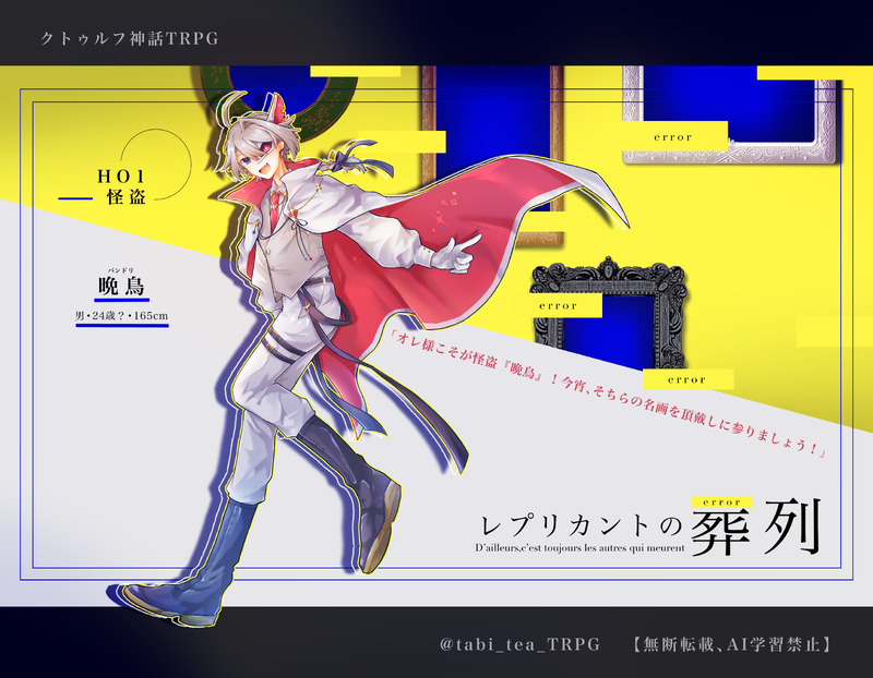 tabi_tea_TRPG☆quiet followDONEレプリカントの葬列 HO1 怪盗晩鳥 #旅茶宅 #旅茶宅立ち絵 Tap to full screen (size:3857x3000).Repost is prohibited Let's send reactions! freqpopularsnackothersPayment processing Replies from the creator Follow creator you care about!☆quiet follow tabi_tea_TRPGDONEレプリカントの葬列 HO1 怪盗晩鳥 tabi_tea_TRPGDONEメリークリスマス(遅刻) 2 tabi_tea_TRPGPASTごだ垢にあげてた絵のまとめ 12 tabi_tea_TRPGDONE四季送り HO壱 春春告 佳乃 tabi_tea_TRPGDONE※獣化NPCも描いたよ 2 tabi_tea_TRPGDONE狂気山脈 HO2-B雷坂 長門 related works tabi_tea_TRPGDONEステガノグラフィHO1 蛇塚あすか tabi_tea_TRPGDONE我厄HO2、虎谷健吾 tabi_tea_TRPGDONE胡桃炸裂症候群 HO刑事小鳥谷 夜一 tabi_tea_TRPGDONE狂気山脈 HO2-B雷坂 長門 tabi_tea_TRPGDONE鰯と柊 HO鰯 折部はやと tabi_tea_TRPGPROGRESSゴダルカ自探達の立ち絵(未完)卓が終わる前に完成しないと思われるため、出すだけ出します… 2 tabi_tea_TRPGDONE四季送り HO壱 春春告 佳乃 tabi_tea_TRPGDONEビスポークランドでなにがあったか? HO2フィルベルテ=ラウル=インノチェンティ 2 tabi_tea_TRPGDONE真夏の風の果て HO2九重谷 官弥 recommended works FutagunAIDONE #ゴダルカ旅薬班薬袋さんと旅茶さん大変申し訳ございません!!!!!(土下座)さすがに表に出すのはどうだろうとなったのでこう……。 2 minai_TRPGMEMOごだ自探 テンプレ置き場なんか諸々解釈変わってるかも 雰囲気で見てください 3 ろしもねSPOILER⚠️今年のバレンタインのホームボイスとイベント料理ボイスのネタバレがあります。 ごちょーDONE大遅刻のホワイトデー🌞 okrt15DOODLEガンガさんのらいんで072するマ卜・・・おずさんのがんがわらさんにをパク・・・オマージュしたよ(勝手に) アトモスDOODLEにょたゆりミツナルの(恐らく)初えっち絵 もくまるDOODLE🥧のらくがきです 3 Shiki_TRPG7DOODLE快刀乱魔 一応現未❌後悔。 kv3622DOODLEミステリオンとツールシェドのいかがわしい絵なのでワンクッションstenny 3