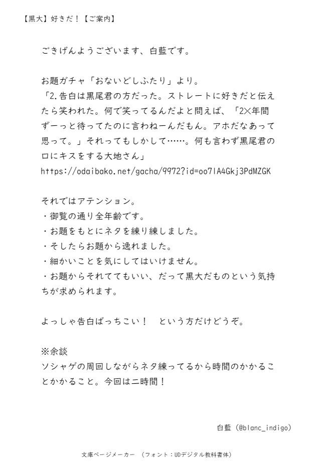 blanc_indigo☆quiet followDONE #黒大 show all(+5 images) Tap to full screen (size:630x928).Repost is prohibited Let's send reactions! freqpopularsnackothersPayment processing Replies from the creator Follow creator you care about!☆quiet follow blanc_indigoDONE 4 blanc_indigoDONE【黒大】だから言いたくなかったのに 5 blanc_indigoDONE18歳以上? yes/no 10 blanc_indigoDONE未来捏造大学生黒大 5 blanc_indigoDONE18↑ y/n 11 blanc_indigoDONE捏造アラフォーに足突っ込んだ黒大。黒尾君が当社比でクズです読んだ後の苦情は受け付けません18↑? y/n 12 related works こはくDOODLE10/14黒大webオンリーにて展示しました漫画です!ありがとうございました🫶 6 itokichi41DONE◆黒大webオンリー【指触れ合うも多掌の因縁】で展示してました 6 SKKY_KEBDONE第0回黒大性癖🔞シャッフルゲームで描いた⚠️触手×黒大と第1回黒大性癖シャッフルゲームで描いた獣人黒大です!pass※18歳以上ですか? y/n 2 mayuchiMAIKINGまだ描きかけですが…雄ッぱぶのやつです halfnoodlesDONE黒大性癖シャッフルお題『泣き顔』 2 SKKY_KEBPAST黒大webオンリー展示2017年発行「bouquet」再録 15 SKKY_KEBDONE黒大のサワムラサンが嫉妬する小話 9 blanc_indigoDONE 6 amakou13MOURNING黒大スケベがみたすぎてここに投げた事を許してくれ 213 recommended works ~咲~DOODLE【今日の八嵐お題】深夜に嵐せつが飛び起きたのでつられて目が覚めた八せ。どうやら悪夢を見たらしい。「麻婆豆腐に入れられて八せに食べられる夢だった…」とのこと。思ってたタイプの悪夢じゃなかった。#お題ガチャ #推しCPに試練 tizyoutoumikmtDOODLE「生徒先生がちゃ」※きめつ学炭煉遅くまで残って勉強してたらきょうじゅろうがみかんくれた#お題ガチャ https://odaibako.net/gacha/1767?share=tw みかん持ってる先生可愛いw tizyoutoumikmtDOODLE「生徒先生がちゃ」きょうじゅろう、たんじろう、授業中ふたりしか分からないジェスチャーすんのやめて。#お題ガチャ https://odaibako.net/gacha/1767?share=tw ジオさんちMAIKINGにほさにワンライ。女審神者。『食欲の秋。食べすぎたからとダイエットをしようとするさにちゃんと、太っていないからと新たな秋の味覚を準備する号さんの攻防が今日も始まる。』#お題ガチャ #同棲カプのゆるい話 1114 1104DOODLEお題ガチャ ③ bezeru_rDOODLEサイコロを差し出す夢主。「出た目の数の合計が30を超えた方が勝ち」「ちなみに私は私の身体を賭けるから、池谷も身体を賭けてね」と言われ絶対負けられなくなった池谷。しかし負けた。#お題ガチャ #なんだかんだバカップルじゃん keiemDOODLE@BLliveTRPGお題箱の🐏と🐸のキス殴り書き15.🐏と🐸のキス。気を抜くと🐏が片手で服を脱がし始めるので、🐏が唇を重ねてきたら恋人繋ぎで両手を塞ぐことにした🐸。手を動かす方に意識を取られなかったおかげでいつもより濃厚な口づけができて満足げな🐏。#お題ガチャ #すけ3ガチャ https://t.co/XaS2AKDP9y 6 🍼🥪🦜REHABILIthat one snowy night 🌨 baiyelimingDOODLE【岁日5:25丨彩蛋】风平浪静时(28p)愚世周格职场pa 28