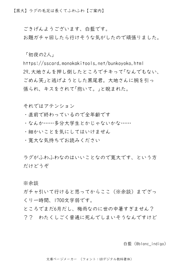 blanc_indigo☆quiet followDONE #黒大 show all(+4 images) Tap to full screen (size:630x928).Repost is prohibited Let's send reactions! freqpopularsnackothersPayment processing Replies from the creator Follow creator you care about!☆quiet follow blanc_indigoDONE 4 blanc_indigoDONE【黒大】だから言いたくなかったのに 5 blanc_indigoDONE18歳以上? yes/no 10 blanc_indigoDONE未来捏造大学生黒大 5 blanc_indigoDONE18↑ y/n 11 blanc_indigoDONE捏造アラフォーに足突っ込んだ黒大。黒尾君が当社比でクズです読んだ後の苦情は受け付けません18↑? y/n 12 related works SKKY_KEBDONE黒大のサワムラサンが嫉妬する小話 9 amakou13MOURNING黒大スケベがみたすぎてここに投げた事を許してくれ 213 SKKY_KEBDONE第0回黒大性癖🔞シャッフルゲームで描いた⚠️触手×黒大と第1回黒大性癖シャッフルゲームで描いた獣人黒大です!pass※18歳以上ですか? y/n 2 halfnoodlesDONE黒大性癖シャッフルお題『泣き顔』 2 itokichi41DONE◆黒大webオンリー【指触れ合うも多掌の因縁】で展示してました 6 こはくDOODLE10/14黒大webオンリーにて展示しました漫画です!ありがとうございました🫶 6 mayuchiMAIKINGまだ描きかけですが…雄ッぱぶのやつです SKKY_KEBPAST黒大webオンリー展示2017年発行「bouquet」再録 15 blanc_indigoDONE 6 recommended works なつきMOURNING短めの、割と前に書いた黒大 10 ~咲~DOODLE【今日の八嵐お題】「寒いから暖めて」と言ったらやせが部屋の奥から電気毛布を引っ張り出してきた いやそうじゃなくて 暖かいからいいけど…#お題ガチャ #推しCPに試練 tizyoutoumikmtDOODLE「お題ガチャ。」※同棲炭煉たんじろうが席を離れた隙に、たんじろうのスマホで自撮りを撮るきょうじゅろう。#お題ガチャ #色々な二人ガチャ https://odaibako.net/gacha/1837?share=tw炭君が携帯にロックかけてないのが不用心に思ったのでこんな写真がた他人に見られたらやばいだろう?って意味を込めて撮った煉さんロックはしっかりかけるようになった炭君。 koyubikittaDOODLE貴方は時間があるなら『膝枕をして照れている早野のゆかくら』をかいてみましょう。幸せにしてあげてください。#shindanmakerhttps://shindanmaker.com/524738 親知らずが痛い皋のためにうどんを柔らかめに茹でる昏見#お題ガチャ #男ふたりの色んなシーン https://odaibako.net/gacha/1739?share=tw 1616 1104DOODLEお題ガチャ楽しい 小さな葉っぱDONEワルロゼ(ワルイージ×ロゼッタ)の短いものです。お題ガチャでお題を頂きました。頂いたお題↓【推しカプシチュガチャ】「好き」と伝えるのが恥ずかしくて何も言えなくなってしまうロゼッタと、それを言ってくれるときを辛抱強く待つワルイージ #お題ガチャ #推しカプシチュガチャ https://odaibako.net/gacha/963?share=tw 347 yuzuknzaki2DONE触手7 前半ラストです☺ 後半はいつか(今年中には…)完成したらぜんぶまとめでDL販売致しますので何卒宜しくお願い致します~! 6 ゆうや。DOODLE待ち合わせに数分遅れてきた進藤。ちょっと文句でも言ってやろうと思ったけどホットココアを首に当ててお詫び!って笑うのが可愛くてどうでも良くなった塔矢。#お題ガチャ #冬のふたり odaibako.net/gacha/9518?sha…ん"ん"ん"ん"!!!😭💕💕💕 mushaDONEうさかど 現パロ ※一緒に住んでいます