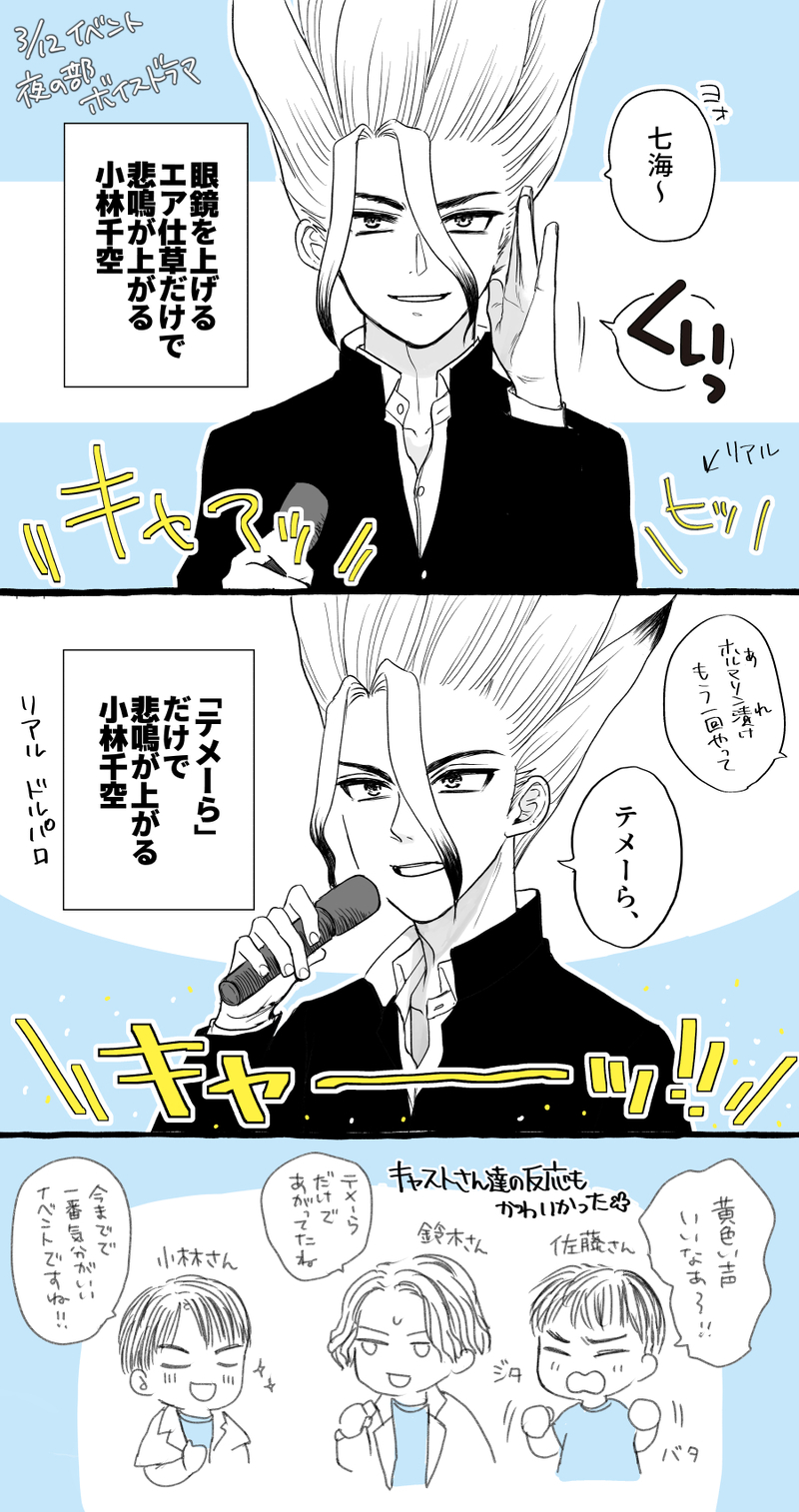 Kazemachi☆quiet followMEMO3/12先行上映イベントにて行われたボイスドラマ(夜の部)のレポもどきです。誤解の無いように説明すると、🐉の妄想する「仲の悪い男同士の決闘」の中に出てくるインテリヤンキー🚀というものです。いや情報量が多い。なんか色々すごかった…すごかったんです… ##dcst show all(+1 images) Tap to full screen (size:900x1704).Repost is prohibited Let's send reactions! freqpopularsnackothersPayment processing Replies from the creator Follow creator you care about!☆quiet follow KazemachiPASTWebオンリーの企画に参加させて頂いた時のイラスト🃏🚀更新のない間もスタンプを送っていただき本当にありがとうございます✨ KazemachiDOODLEアニマルぬいちゃんが冬毛+30センチくらいの大きさになったら…という夢シチュ(?)から始まった、冬毛でもっふもふの🦇🍙=わたゲさんと🚀ちゃん+αの小ネタです謎しかないので雰囲気で見られる方向け 4 KazemachiDOODLE🚀ちゃんのハグ変遷 2 KazemachiDOODLE※ケモ/ゲ千ワオく~ちゃんブームが来ていたんですよ東武コラボ行きたいなあ 4 KazemachiDOODLEちびぬい🍙と🚀ちゃん(フォロワさんのぬい撮りシチュFA) KazemachiDOODLE大好きデパ千ヘアアレンジ(ヘアアレンジと言い張る) recommended works usaDONEいえーい ぴーすぴーす めがねのひ usaPAST一生好き RanPROGRESS可愛く描けた🤗💕 akiranhinaTRAININGゲ千は回帰の意味を持つ「腹」へ、賭けに勝ってキスをします。この後、騎乗位でアンアンいうのは千空ちゃん。マグロにご奉仕「ちょ、ちょっと。千空ちゃんっ」 「ぁ?」 煩わしそうに千空が顔を上げる。 「お腹壊しちゃうから、おへそ舐めないで」 「賭けに負けといて注文が多いなぁ、料理人か?てめぇは」 「ぐぅ」 悔しげに彼は口を尖らせる。 「マグロよろしく、ご奉仕されてろ」 千空は勝者の権利を行使した。 140 akiranhinaTRAININGあなたのゲ千さんは【移り香】をお題にして、140字以内でSSを書いてください居ても居なくてもテメェの存在感はデケェな(移香はたぶん花の香り薬品の調合がひと段落したところに、スイカがラボを覗き込んだ。 「アレ?」 狭いラボを見回して首を捻る。 「どうしたんだ、スイカ」 薬品を一つ一つ確認しながら棚に戻していたクロムが尋ねる。 「ゲンがいると思ったのに。居ないんだよ?」 千空は少女の疑問に合点がいって苦笑いを浮かべた。 140 akiranhinaTRAININGゲ千へのお題は〔手を取る〕です。〔会話文のみ禁止〕かつ〔キーワード「心臓」必須〕で書いてみましょうテーマ前段じゃん。手も取ってないぞ、だメンタリスト。でもまあ、覚悟を決めたことには百億万点やるよ、ゲン。指輪を贈る柄じゃない。柄じゃないことは自分自身が一番よく分かってる。 ここぞという時、俺はちゃんと出来ていたのに。マジシャンだからポーカーフェイスはお手の物だし、メンタリストとしてセルフコントロールだってちゃんと出来る。 でも、今、顔が紅潮するのを止められないし、言葉もうまく紡げない。 138 akiranhinaTRAININGあなたの“ゲ千”でのお題は《君の気持ちが分からない。》です。恋するメンタリストは彼のことだけ理解できないゲンは遠目でラボに居る千空を見る。コハクほどではないが目は良い方だ。 何かゲンには分からないクラフトをクロム達と愉しんでいる。 ゲンは千空が好きだ。惚れている。 だが、彼と付き合う気はない。 それなのに千空はゲンに告白をしてきた。 純情科学少年をする気はないのだろう?何故、俺? 139 akiranhinaTRAININGあなたは『軋むベッド』でゲ千の140字SSを書いてください。これ、どう言う状況?バ、バイヤーすぎるゲンは処理落ちした脳で視界に広がる光景を記憶する。 『これ、夢だよね?もしかして、ドッキリ?』 この石の世界にありえないだろ、ドッキリ。と、突っ込みを入れてみる。 両手を抜けないように頭の上で拘束されて軋むベッドに転がされた。 拘束した本人は彼の息子を咥えて自分の後ろを解してる。 140 akiranhinaTRAININGゲ千へのお題は〔最悪の雨〕です。〔「!」の使用禁止〕かつ〔「黄」の描写必須〕で書いてみましょう。この幻は中坊で多分千空は小学生。現パロ。最悪と思われた雨は最良の出会いを導いた幻は突然降り出した雨空を見上げた。 多分通り雨だろうと花屋の軒先を失敬して雨宿り。 こんなことなら学校サボらずに校舎内で時間を潰せば良かった。 ふと目の前を黄色い物体が通り過ぎる。 それが小さな子供の小さな傘だと気付き薄くシルエットが透けているのを観察した。 「ゴイスーな髪型」 139