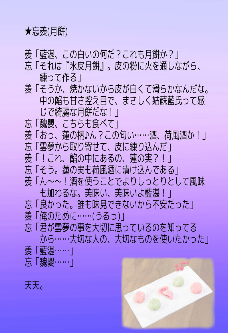 mizukigh☆quiet followMOURNING陳情令のみなさんに色々食べてもらいました第二弾。忘羨の氷皮月餅はできていたんですが、お友達が「少年組とか三尊も」と言ったので、作りました(笑)子真くんの魏先輩大好き加減と素直じゃない叔父甥が好きです。 #陳情令 theUntamed #忘羨 WangXian #少年組 juvenileClass #三尊 sanzun #叔父甥 unclesNephews #小ネタ anecdote #小話 brief(comic)Story show all(+3 images) Tap to full screen (size:1404x2048).Repost is prohibited Let's send reactions! freqpopularsnackothersPayment processing Replies from the creator Follow creator you care about!☆quiet follow mizukighSPOILER刀剣乱舞、ゲームの大侵寇。今回の戦いのネタバレ。こういうこと??弊本丸の初期刀は山姥切国広です。※ねんどろいど画像です mizukighMOURNING陳情令のみなさんに色々食べてもらいました第二弾。忘羨の氷皮月餅はできていたんですが、お友達が「少年組とか三尊も」と言ったので、作りました(笑)子真くんの魏先輩大好き加減と素直じゃない叔父甥が好きです。 4 mizukighMOURNING陳情令の五大世家+義城組に、色々食べてもらいました。みんな生きてる世界線。姑蘇藍氏:酢豚雲夢江氏:シチュー蘭陵金氏:何かお高そうなやつ岐山温氏:牛タン大盛り清河聶氏:スフレパンケーキ義城組:餅 6 mizukighMOURNING侍展での刀剣男士達の会話②侍展が終わった時に考えたもの。 558 mizukighMOURNING侍展の時に思い付いた小ネタ①まだ会期途中の刀剣男士達の会話。 347 related works ぬのさとDONE魔道祖師日本語版ラジオドラマの販促イラストとツイートがおもしろすぎたので。なんど考えても、応援団長ってわからないよ。あっはい、考えるな、感じろですね。Twitterの再掲です。 959 mizukighMOURNING陳情令のみなさんに色々食べてもらいました第二弾。忘羨の氷皮月餅はできていたんですが、お友達が「少年組とか三尊も」と言ったので、作りました(笑)子真くんの魏先輩大好き加減と素直じゃない叔父甥が好きです。 4 youmeihyDONE金光瑶誕生日ギャグ漫画。「食の好みが合わない三尊」 ブーンDONE現代AU三尊脱いではないが尻は出てる。入ってはないが入れようとしてる。曦「たまには家以外もいいかと思いまして…知人に場所をお借りしました」瑶「それで高層ビルですか‥え…?こんなところで?見えたらどうするんですか?!大体…」明「孟瑶、先月の営業成績が酷すぎる…お仕置きが必要だ…」瑶「設定雑すぎませんか」曦「孟瑶くん、明玦部長の言うとおりです…」瑶「絶対会社勤めした事無い人の設定…」 ブーンDONE裏スイーツ三尊肌色注意です!一応R18でお願いしまふ。。。あたりのつもりで引いたのをそのまま主線にしちゃったから雑いあんど体細いな。。。 oio_oi3DOODLE三尊 chunyang_3MEMOCQL50話の後の懐桑と藍曦臣の話(https://poipiku.com/2517302/5280800.html )に至る兄上と“兄弟”の話。nielanなのかyaolanなのか?みたいな感じですけど、どっちも違うベクトルで大切だったんだろうなぁと思う。“兄弟”にこだわる兄上の話です。お誕生日に上げる話じゃない気がするけどおめでとうございます!(遅刻)※竜胆要素は原作からです 4567 ブーンDONE誕生日にいただいたぐらさんの三尊にうちのシングルベッドを使ってもらいました~~💚💛💙やっぱりシングルは狭いね。ベッドは大丈夫でしたがちょっと振動が下の階まで響いたんじゃないか心配です。ベッド位置動いてたしね。(あ、酔ってません) toui300ctPAST 6 recommended works 廼比(のひ)DOODLE寒がりさんも良し hyuga_kai31PAST白山くん祈願で描いたものこれ描いて、からあげを供物にして、お祈りしまくったら来ました。 みなもりんMAIKINGSD御手杵極。結城秀康公、松平忠直公は好きな戦国武将、大名です マヨコDOODLEらぶフェス2017のここ可愛い…… もやし/松尾遼PAST確か初描きの蜂須賀 いかてんPROGRESSツイッターで最近描いてるやつの続き。ちまちま進めてる。 (幽)夢骨堂DOODLE100均のアルコールマーカーの実力とやら。 2 はらずみDOODLE 鈴春゜DOODLE今日岩さんが帰ってきたので以前描いた推しと一緒に#刀剣乱舞 3