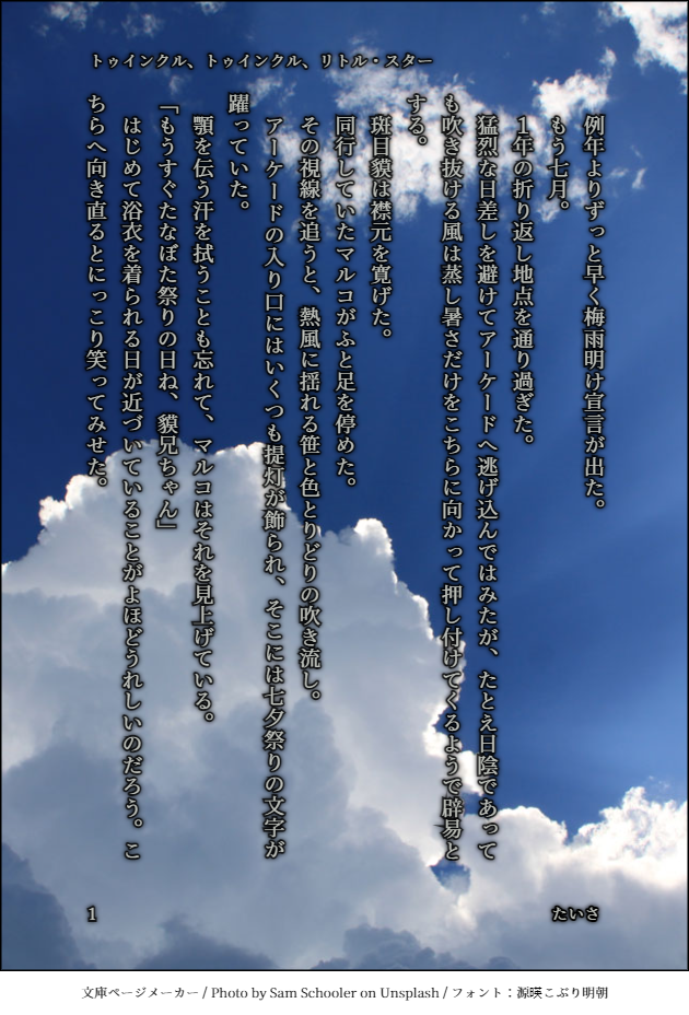 たいさ☆quiet followMAIKING先日文庫メーカー様を使って書いたbkmr七夕前日譚。そのうち加筆して改めてうpしたいな、などと show all(+6 images) Tap to full screen (size:630x928).Repost is prohibited Let's send reactions! freqpopularsnackothersPayment processing Replies from the creator Follow creator you care about!☆quiet follow たいさINFO2023年11月23日開催 COMIC CITY SPARK18 Liars agitation2 サークル take it easy 参加します!スペースは東京ビッグサイト 東2ホール ネ18a今回の新刊、ばくまるの盟友わか様による描き下ろし。デザインまでしていただきました。わか様の新刊マンガあります!よろしくお願いいたします! たいさDOODLEハグの日。やや遅刻 たいさDONENOVELMBER2022の36個のお題より。好きな時に好きなお題をこなしています。13巻のネタバレを含むので、ワンクッション置いています。 825 たいさDONE2023ねんかきぞめ。まららめ一家。えっちな絵ではないのですが、肌色多めなのでご注意ください。 たいさPASTnovelmber2022まとめとusgiフレグランス発売の報にカッとなって書いたもの。ばくまるSSまとめです。12/26抜けてたページ追加しました。ヒィン。 15 たいさDOODLEハロウィンまーくんネコチャンコスプレ。女装注意でヤンス。