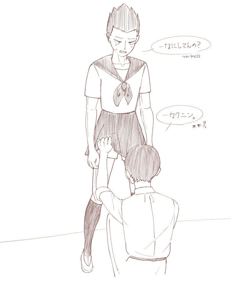 体育祭か学祭かなんかで女装することになった金田一と、よくあるスカート捲りかまちょに見せかけて彼氏チェックを行う國見の図。