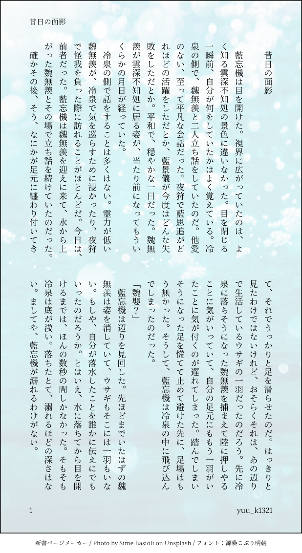 yuu_k1321☆quiet followDONE『昔日の面影』全文 show all(+41 images) Tap to full screen (size:618x1132).Repost is prohibited Let's send reactions! freqpopularsnackothersPayment processing Replies from the creator Follow creator you care about!☆quiet follow yuu_k1321DONE『昔日の面影』全文 42 yuu_k1321DONE蓮源郷cql忘羨(知己)50話後、雲深不知処に蓮池を作る二人の話。かとうさんとの合作です。 57 yuu_k1321DONE長編序章 18 yuu_k1321DONE二神の昇天 1/2R-18部分を含めた全文。 56 yuu_k1321DONE二神の昇天 2/2 20 yuu_k1321DONE知己忘羨の日常④『サンタマリア』 36