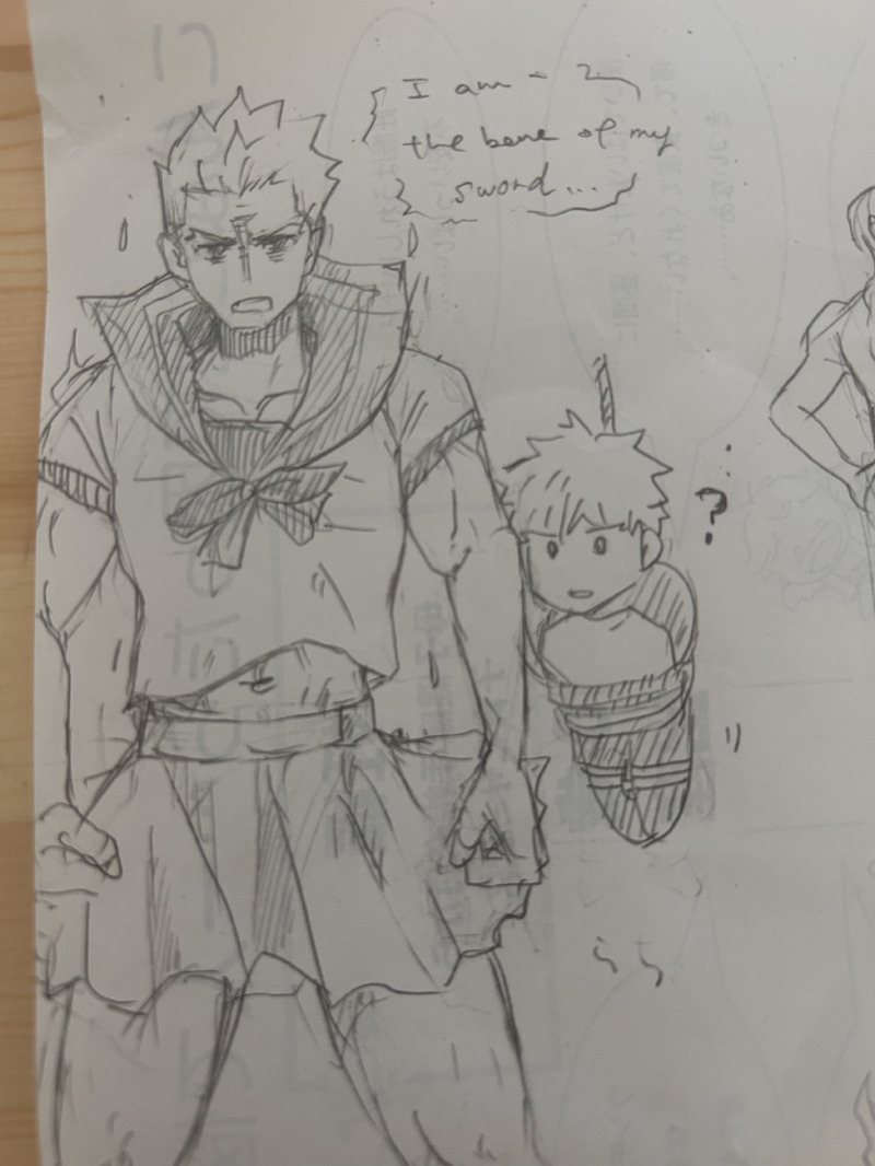 なぜこんな絵ばかり…かなしいが🀄️あちゃ狂いますね。好き。ストーリーで誘拐されている士郎も描いた。cpに当てはめたら緊縛and制服プレイみたいになり、なかなかハードな士弓が爆誕してしまった。