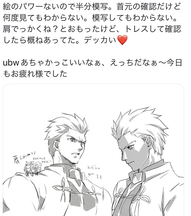 mrnc☆quiet followDOODLE文字を打つのが面倒くさくて… Tap to full screen (size:991x1117).Repost is prohibited Let's send reactions! freqpopularsnackothersPayment processing Replies from the creator Follow creator you care about!☆quiet follow mrncDOODLE20分落書き日記 シローデイにヒロイン置いていく系男子、危うい笑顔のシローがかきたくて焦燥感に駆られもどかしく感じる親友たち(ヒロイン男子達)の後ろに仲良く夕飯の買い出しする槍弓を添えたい。本格的にペン入れ色塗りの仕方を忘れた。悲しい。 mrncDOODLE職場にてメモ帳をゲットしたので1人休憩中にメモる資料調べれなかったので雰囲気だけこんなの描くのは久々にイーミャシェロの…小説よんだせいですね。やっぱすごい。もっと狂気に満ちた讐クラスの赤弓もチャレンジしたら面白いかも。 mrncDOODLEもちが来た時の日記、自分に何かあったときに家族にバレる腐り絵は残さないという鉄の掟を軽々とやぶる。ノートに残してしまった。サマカジもちかわいい…! 3 mrncDOODLE2025夏イベ特異点に呑まれて頭ゆるふわの解放的な夏モードになっちまった夏のカジュ兄のケツに加護のルーン仕込んで過ごさせるやつのチラ裏に描いた落書きをノートに移した。正気になったのにケツ仕込まれてるのがいいんす。今は悩んでるセリフのとこもそのうち埋めたい。③枚目は元のチラ裏のやつ、こっちアングルのが良かったかも。きゃゆみ、前から見るか後ろからみるか…ああ打ち上げ花火だ 3 mrncDOODLEやっと一日目の記録終わったと思ったら女難(自業自得)英雄トークとか推し女の子達と水鉄砲始めたりランサーいじりとかもうダメだ。全然間に合わない。この際上手くなくていい自由に早く描けるようになりたい自分お盆休みあと1週間いけます!まだ休めます!やらせてください赤弓を探せ状態なんすが、かっこいいアチャかきたいっすあとすけべも 3 mrncMOURNING夏が来る…!キャニキがずっと止まらない。盛大にペン入れ間違えたよ泣いたよキス前にキャップを後ろに被り直すのは見たいけど槍ニキぽいかもしれない。ただ浮かれサマカジにはキャップ直して制裁ガチギスかましてほしい🆚キャは前被りのまま大衆の方に少し頭傾け見えないようにしそう。これぞキャクラスによるキャ弓のための陣地作成。