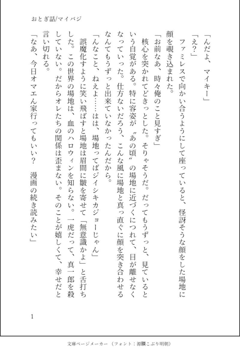 shinkawa09☆quiet followDONE『おとぎ話』『長い夢の終わり』最終軸のマイバジの話。記憶ありのマイキー視点と、記憶なしのバジ視点があります。 #東京【腐】リベンジャーズ #マイバジ mybadi #マイばじ show all(+8 images) Tap to full screen (size:1080x1579).Repost is prohibited Let's send reactions! freqpopularsnackothersPayment processing Replies from the creator Follow creator you care about!☆quiet follow shinkawa09DONE『愛は無敵』英A小説のXの続き、R18部分です。18↑? 5 shinkawa09DONE『ネバーエンディングストーリー』はぴばじpartyの書き下ろし小話です。臆病なマイキーの話。最終軸のマイバジです。 6 shinkawa09DONE『ショートケーキ』デートをお題に書いた小話です。変わってしまったのに変わらないフリをする幼馴染み二人の話。マイバジ。 4 shinkawa09DONE『アンドロメダ』ファーストキスについて一虎に突っ込まれるバジの話です。マイバジ。 6 shinkawa09DONE『何もない世界』東卍が巨悪化した世界線でバジのことを想うマイキーのひとりごと。 3 shinkawa09DONE『浅漬けとマイバジ』フォロワッサンと浅漬けをお題に書いたマイバジ小話です。 5 related works なるかみうめこTRAINING例のチャイナまば🥰💕バの露出多くてハッピー🙌一枚目背景あり二枚目背景なしこのグッズミニキャラとても可愛いコラボカフェ行きたいなぁ… 2 なるかみうめこDOODLEある朝のうちのぬい幻覚こんなん見せつけられると、キュンとする なるかみうめこDOODLEぱずリべのあれえくそしすと…🤦!ばんぱいあ、もう一人いるってゼッタイまいき知ってたよねっ😘💕その上で、このコス選んだよねっ😘💕💕追記:あくまコス、ばじがやるかもって思ったのか……(とっぷくエンド、残念!マよ😂😂😂しかし、あくまコスエンドは…こんやはおたのしみですね😉) なるかみうめこDOODLE某ぐっずで居残りしてるまばこれはこれで堪らんよくよく考えたら、最終軸のまばって中身が18歳のマと8歳のバ…???え…?なんだと???これについてはクワシクいつか描こう👍(🐥ちゃんが、『🎋くんホントは何歳?』って訊いてるシーンがいつか重くのしかかるまば😂!) なるかみうめこDOODLEマイばじ前提の真ばじ(若干最終巻ネタバレ注意)お洗濯の匂いってご家庭で違うよねって話😌✨2枚目は妄想のきっかけ😉💕 2 なるかみうめこDOODLEむかしらくがきしようとして頓挫してたやつみつけたぜんらのまま放置していたふたり服を着せました☺️❤️💙 なるかみうめこDOODLE二週目まいき、記憶よりも近かったバとの距離にタジタジ。もちろん今度は淡々と落とすつもりでいたのはいたけど、まさかこんなに近かったとは、と逆に怖気づいている図。ヘタレ攻め好き…😳💕💕💕 なるかみうめこDOODLE髪型あれこれマのアレンジ増やしてみたこのグッズのバの髪型たまらぬ……😳バは意外と大人しくアレンジさせてくれるのに、マは嫌がってさせてくんないのかな😂😂😂?それはそれでよい🥳 なるかみうめこDOODLE🧩りべイベントのまば鼻の頭のバンソーコーわすれた😇清書するとき直しとく
