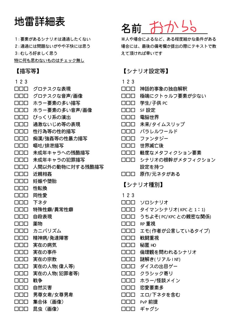 かわいいひよこ☆quiet followDONE地雷チェックシートです素材お借りしました。 show all(+2 images) Tap to full screen (size:1448x2048).Repost is prohibited Let's send reactions! freqpopularsnackothersPayment processing Replies from the creator Follow creator you care about!☆quiet follow かわいいひよこDOODLE怒らりた悪エイ原稿未通過❌passは例の人の名前漢字でスペースなし かわいいひよこSPOILER芋虫現行未通過×差分! 4 かわいいひよこDOODLE悪エイ現行未通過×NPCのバレンタイン幻覚 かわいいひよこMOURNING正イデ現行未通過×はい。さんのイラスト、ピクミンブルームを入れたらピクミンが運んできてくれて笑ったスクショ解像度の高いデートになっちゃった かわいいひよこSPOILER悪エイ現行未通過×曲パロ描いてたけど飽きちゃったトレス かわいいひよこSPOILERなるほどね……悪エイ現行未通過×人のリプを勝手に盗み見たNPC絵 recommended works ぎらっふぇDOODLE現パロ門キラスロットで前に出てきたやつの少々いかがわしい落描き。テーラーかどくらって超語呂がいいと思いませんか。あととにかくバニーが好きで本当にすいません。 TSU_HALDOODLE⚠️正イデ ❌現行未通過 ⭕️自陣本日卓中に起きたことまとめ 3 シロちDOODLE正偽のイデアげんみ❌正イデNPCファンアートです #正偽のイデア 2 シロちDOODLE正偽のイデアげんみ❌ 正イデNPCファンアートその2! #正偽のイデア 2 ましろ⚙SPOILERCoC「正偽のイデア」 現行・未通過×HO2のディスプレイとログ 17 せとCoCDONE正イデ自陣 ネタバレない 3枚目は経済学部時代のHO3参護従吾とHO4右京誠人 3 せとCoCDONE正偽のイデア 現行未通過❌性癖でHO3HO4表情の対比を描きたかったというか実は大体が対比してる参護と右京苦しい〜〜 otgr_1109DONE【塚不二】差分とか修正版とかてづかくんこんなに優しい顔してましたあとは私の趣味 4 mrrrrrrDOODLE※ ラトフルわるいやつに捕まっちゃった~リョナ❤️🩹🪡ちゃんです嘔吐・流血あります