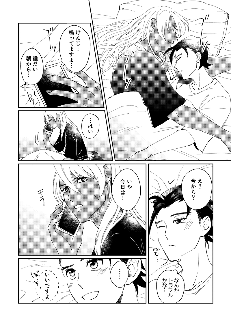 shu10gookabe☆quiet followDONEきょおどお泊りして一緒に寝て何気ない会話してほしいオチはないよ…描きたい絵を詰め込んだだけの漫画 #キョオド archedStick show all(+2 images) Tap to full screen (size:1460x2068).Repost is prohibited Let's send reactions! freqpopularsnackothersPayment processing Replies from the creator Follow creator you care about!☆quiet follow shu10gookabeDONEkkirでエロいのとかちゅーとか鼻血とか1枚目と2枚目のみ繋がっててあとは短話PASS:18才以上ですか? 6 shu10gookabePASTデス×クラークでクラレイクラ 9 shu10gookabePASTたぶん10年前に描いたであろうルクレイと思って描いていた漫画とかクラークとレイ㌧のBLとかクラークとブレンダとかいろいろそのうち増える 43 shu10gookabePROGRESS【真ハム】冬コミサンプルに上げるR18ページエロを頑張っている エロに詳しい人修正甘かったら教えて…PASS:18才以上ですか? shu10gookabeDONE冬コミ表紙できたで!ちょっと脱いでる shu10gookabeDONEきょおどお泊りして一緒に寝て何気ない会話してほしいオチはないよ…描きたい絵を詰め込んだだけの漫画 3 related works こてこDOODLE全部キョオド妄想 4 とりまるDOODLEキョオド(1715)昨日見たキョオド1715の夢の備忘録(ちゅうがくせいだんしが夢見るレベルの内容だけど一応ワンクッション) こてこDOODLE⚠︎先天性女体化です とりまるDOODLEキョオド絵茶(女体化えろの方)※女体化注意 とりまるDONEハロウィンにかこつけていちゃつくキョオド(キョの髪短い)ちょっと背後注意なので念のためR18 とりまるDONEキョオド(※注意 二人ともにょた化)セッしないと戻れないにょた化漫画の続き2枚目は特に背後注意百合えち作法に明るくないため、2枚目の3コマ目は各自好きな作法を当てはめてください。 2 とりまるDONE1715 キョオド ちょっと暗い若気の至だからと目をそらす 3 とりまるDOODLEちょっとえっちなキョオド2枚 2 こてこDOODLE獣人×人間のキョオド(見せてるだけ) recommended works 高間晴MAIKINGチェズモクの話。あとで少し手直ししたらpixivへ放る予定。■ポトフが冷めるまで 極北の国、ヴィンウェイ。この国の冬は長い。だがチェズレイとモクマのセーフハウス内には暖房がしっかり効いており、寒さを感じることはない。 キッチンでチェズレイはことことと煮える鍋を見つめていた。視線を上げればソファに座ってタブレットで通話しているモクマの姿が目に入る。おそらく次の仕事で向かう国で、ニンジャジャンのショーに出てくれないか打診しているのだろう。 コンソメのいい香りが鍋から漂っている。チェズレイは煮えたかどうか、乱切りにした人参を小皿に取って吹き冷ますと口に入れた。それは味付けも火の通り具合も、我ながら完璧な出来栄え。「モクマさん、できましたよ」 声をかければ、モクマは顔を上げて振り返り返事した。「あ、できた? ――ってわけで、アーロン。チェズレイが昼飯作ってくれたから、詳しい話はまた今度な」 そう言ってモクマはさっさと通話を打ち切ってしまった。チェズレイがコンロの火を止め、二つの深い皿に出来上がった料理をよそうと、トレイに載せてダイニングへ移動する。モクマもソファから立ち上がってその後に付いていき、椅子を引くとテーブルにつく。その前に 2010 高間晴DOODLEチェズモク800字。とある国の狭いセーフハウス。■たまには、 たまにはあの人に任せてみようか。そう思ってチェズレイがモクマに確保を頼んだ極東の島国のセーフハウスは、1LKという手狭なものだった。古びたマンションの角部屋で、まずキッチンが狭いとチェズレイが文句をつける。シンク横の調理スペースは不十分だし、コンロもIHが一口だけだ。「これじゃあろくに料理も作れないじゃないですか」「まあそこは我慢してもらうしかないねえ」 あはは、と笑うモクマをよそにチェズレイはバスルームを覗きに行く。バス・トイレが一緒だったら絶対にここでは暮らせない。引き戸を開けてみればシステムバスだが、トイレは別のようだ。清潔感もある。ほっと息をつく。 そこでモクマに名前を呼ばれて手招きされる。なんだろうと思ってついていくとそこはベッドルームだった。そこでチェズレイはかすかに目を見開く。目の前にあるのは十分に広いダブルベッドだった。「いや~、寝室が広いみたいだからダブルベッドなんて入れちゃった」 首の後ろ側をかきながらモクマが少し照れて笑うと、チェズレイがゆらりと顔を上げ振り返る。「モクマさァん……」「うん。お前さんがその顔する時って、嬉しいんだ 827 tv_two_xqPASTかべうちからぽいぴくに移転 9 高間晴DONEチェズモク版ワンライ「カフェオレ」「約束」 3 高間晴DONEお題箱からのリクで風邪を引くチェズと看病するモさんの話。チェズモク。■いちばんの薬 とある国で拠点にしているビル。上階にある執務室にて。 モノトーンでまとめられた無駄のないスタイリッシュなこの部屋は、組織を率いるチェズレイの好みに合わせたものだ。室内にはドアの前に一人、チェズレイの側近である黒服の男が控えている。そんな中でチ
