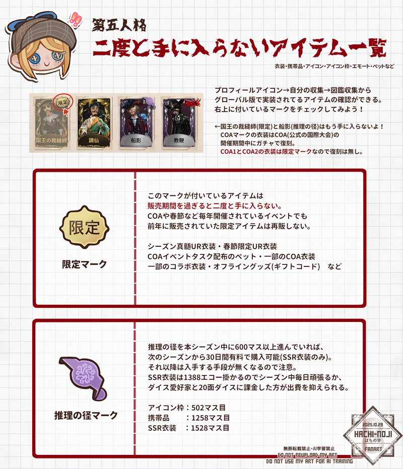 取り忘れで後悔しないように、第五人格で二度と手に入らないアイテムまとめてみました。
