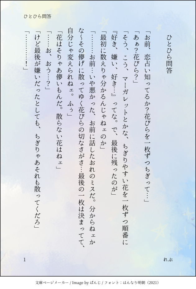 れぶsz☆quiet followTRAININGひとひら問答(会話のみ) ##サンゾロ show all(+4 images) Tap to full screen (size:630x928).Repost is prohibited Let's send reactions! freqpopularsnackothersPayment processing Replies from the creator Follow creator you care about!☆quiet follow れぶszDOODLE昨年のサン誕、ゾロ誕、出した本の表紙、サクカです 4 れぶszDOODLEセルフアンソロ書き下ろし「残馨」の元ネタ。過去に別垢にて公開していた歳の差漫画です。当時読まれた方がいたら本当にすみません。実はこれは気に入っていてどうしても本当はサゾとして描きたかった作品でして、このたび小説としてサゾに出来たのでした…完全なる私の我儘です。小説の方を読んで下さったら、あーこれが元ネタねとチラ見して下さいね! 7 れぶszDOODLE片想い 19さい。 2 れぶszPAST「告白」3ページ過去作。両翼ブロマンスのつもりで描いたやつです両片思いなのかもしれないふたり。 3 れぶszDOODLE れぶszDOODLE真ん中バースデー2023に寄せて永遠に終わらないふたりであれ!