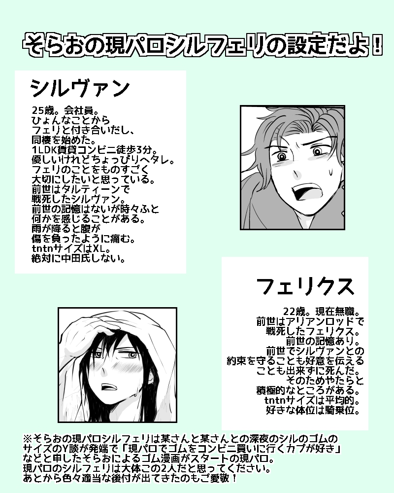 sora_ssp☆quiet followINFOそらおの現パロシルフェリの設定をまとめました。 #そらおの現パロシルフェリ soraosCurrentParo-silferi Tap to full screen (size:800x1000).Repost is prohibited Let's send reactions! freqpopularsnackothersPayment processing Replies from the creator Follow creator you care about!☆quiet follow sora_sspINFO2024年12月1日シルフェリオンリー発行予定の酒飲みシルフェリ小話詰め合わせ本「champon A5/本文68P/600円/R18」です。青√、現パロ、他√、シリアス、ギャグ、エロなど5本詰め込んだちゃんぽん本。1本再録あり。悪酔いしないようにお読みください!※サンプルにR18内容は含みませんが、R18本となります(R18部分の多くは再録部分で新録部分はほとんどR18はありません) 13 sora_sspDONE6/30 シルフェリオンリー『約束の日からずっと』で頒布する新刊「俺はまだその先を知らない」のサンプルです。最後のページのみ前ページと繋がっていません。 10 sora_sspPROGRESS6月のシルフェリ本進捗 sora_sspDONE一応学生シルフェリ初夜。エロギャグです。かっこいいシルはいません。本番の話なのでR18にしていますが、ギャグなので全然エッチじゃないです。おうさ君だし…。エッチを期待した人ごめんなさい…笑 4 sora_sspDONE現パロシルフェリ。またゴムネタです。本番真っ最中。シルフェリです。シルフェリです!!!!!注意書きで大丈夫そうだったらお願いします…。 4 sora_sspDONE現パロシルフェリ。またゴムネタ。フェリクスのアレってでかいよね。これの逆バージョンみたいなものです。https://poipiku.com/328682/7435699.html 3 related works sora_sspDONE現パロシルフェリ初夜。さっきのから続いたやつ。本番はないよ! 3 sora_sspDONEお題いただいた「現パロでバリウムを飲まされて回されるシルとフェリ」です sora_sspDONE現パロシルフェリ初夜編4Pまでできたのであげます。続きは多分来週…! 4 sora_sspDONEhttps://poipiku.com/328682/1778056.html?10963 ゴムの日なのでこれの続きです。めっちゃ背後注意。 3 sora_sspDONE現パロで絶対ゴムをつけるタイプのしるふぇりの話のやつ 2 sora_sspDOODLE現パロシルフェリ。同棲してるけどまだセッしたことない二人の漫画。 sora_sspDONE現パロシルフェリ。ツイッターで話してたネタのやつ。この間のゴムネタより前の時空です。フェリにまだ恥じらいがある。 2 sora_sspINFOそらおの現パロシルフェリの設定をまとめました。 sora_sspPROGRESSシルフェリ現パロ初夜進捗です。後でまとめた時消します… recommended works sora_sspDONE現パロシルフェリ。ツイッターで話してたネタのやつ。この間のゴムネタより前の時空です。フェリにまだ恥じらいがある。 2 sora_sspDONE現パロシルフェリWEB無配漫画②「コンビニっていろんなゴム売ってるよね」①も②もゴムネタです久々の…。意図してないんですがこの漫画を読んだ後に①に戻ると続きに見えなくもないです。 5 sora_sspDONE現パロシルフェリWEB無配漫画①「絶★倫」 2 yururu0312DONE無理やり気味シャアムです一部トレス有18歳以上の方はyesでどうぞ! guacatosDOODLE[ gawthaway ]gawman nobile x hathaway noa 3 pics, from june i think... 3 @Baaaaaka5482861DONE🧠クチュ🧂の落書き(微グロ微リョナ) 2 outsu_REHABILIコーライくんの✍️ボールください♡な星昼 3 yayoi337DOODLEカノヨ貼紙こんなかんじ matu_wassanDOODLE構図練習主ボシュ