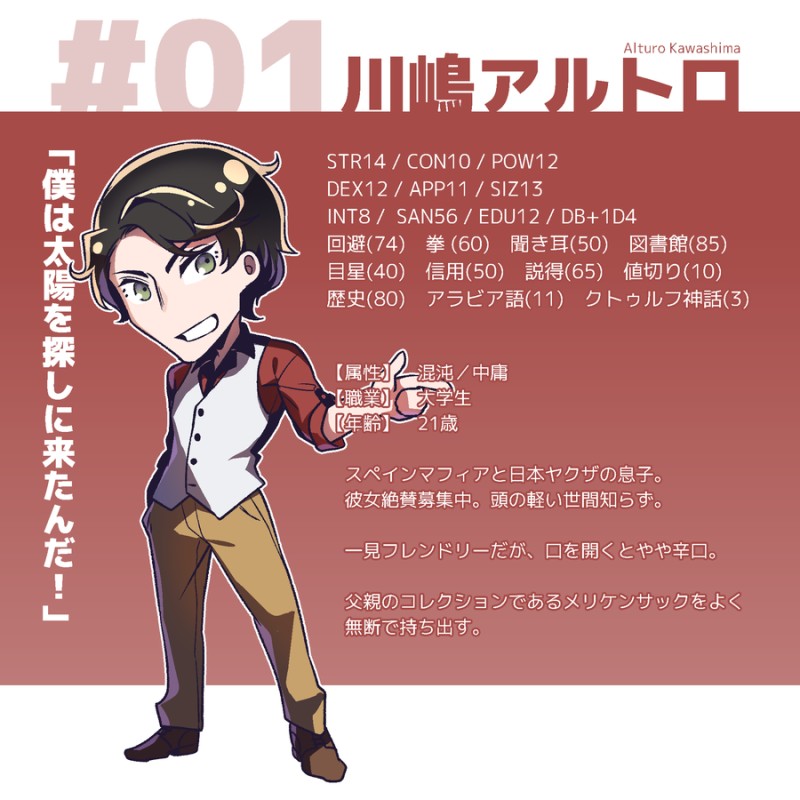 ---☆quiet followDONE2021年1月現在の探索者たち。 ##TRPG #CoC show all(+15 images) Tap to full screen (size:900x900).Repost is prohibited Let's send reactions! freqpopularsnackothersPayment processing Replies from the creator Follow creator you care about!☆quiet follow ---PROGRESS野宿先でも描ける、そう、アナログならね。 3 ---PROGRESSFor my ancestors. Just to keep privacy, I locked the post. If you are interested, please be kind to send me a message(DMok) via somewhere. 9 ---MOURNINGファンアか…? 学生時代に課題として生産した諷刺画。ちょっとキツいやつもあるので注意してください。 7 ---MOURNINGファンアか…? 高校の美術の授業で描いてたやつ。大体自創作から来ている。 7 ---MOURNING10代の頃『フランケンシュタイン』(原語)を読んだ時に生産した課題。 ---MOURNING10代の頃『精霊たちの家』(原語)を読んだ時に生産したらくがき。 3 related works みもりよぞらDOODLE現代入りネタで、色々な手違いが重なって某奇祭の御神体に跨る事になった獣人の男の娘、この時期はこの類(子孫繁栄祈願?)の祭りが多いそうで。 小鳥遊PROGRESSハイフェッツ草案 きよし@キバ&ウィザード履修中DONETRPG「デッドラインヒーローズ」のPCキャラ 「オダマキ」身長(ヒール込み)189cmのオネェ totukiDONEFateTRPGで使ったキャラ絵。オリ鯖オリマスターご注意。 5 きよし@キバ&ウィザード履修中DOODLETRPGで作成したPC 圭(ケイ) 28歳「男娼の限界腐男子」と言う設定 みもりよぞらPAST獣人(げっ歯類のチンチラ)のハイプリースト(男の娘)[性格]人懐っこくスキンシップをとるのが好きだが、基本的にインドアで面倒くさがりな感じ ぽんずDOODLE霧一とロコン誰にも賛同してもらえないことを前提に言うんだけど、なんか似てる気がするんだ…前髪のあたりとか?かわいい今ふと思ったけど、直人はサーナイトとか並べたいな~PC×ポケモンはたまーに見たくなるね 発芽ゴリラPROGRESS何もないのもアレなので立ち絵進捗ポイポイ!前上げたのと大して変わってないとか言わない! #進捗 #TRPG りゅうしDOODLEメカバレ風 recommended works misumiDONE使ってなかったクラフト紙のノートと白ペン見つけたのでおじさま描いてみた。白ペン楽しい〜 noguchikishinPAST鎌バタフライ kyoDOODLE いちおかしPASTTRPGの立ち絵。赤サングラスだけど刑事だ……庭師は何を口遊む HO1でした。2枚目はLINEスタンプ風落書き。 2 ショウカHappy New Year【干支シリーズ】卯+猫+子 キツキトウMAIKING2020/1/23ほくほく。鮮やかな色合いは魅力的だけどな…疲れるんよ。誰かの作品では惹きつけられるのに、自分でそれを描くのはしんどい。いつも「彩度一つ上に上げないと」な色選びしてる…。技術伴ってなくて、描く作品達に申し訳ない。でもな少しくすんだ作品も好きなんだよ…。ふと彩度調整いた時の変わり具合に、「おお!」となるし、「でも、変える前のも好きだなぁ…。」てなるし。 2 あしすPAST貼ったれ~~二回目 設定は精神の中です 19 エヌ.DONE泣き虫ゾンビくん。久々の男キャラ。名前どうしよっかな。 ぽそDONE無心で描いてたイチカ