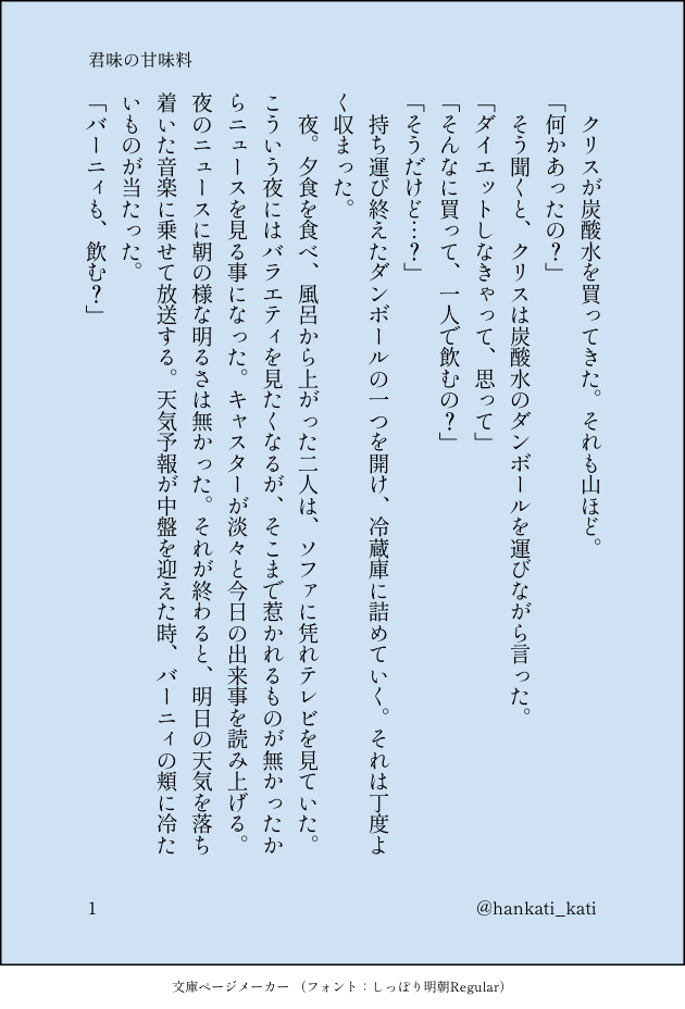 オパナピ置き場☆quiet followDONE久しぶりなバニクリです〜。炭酸水を見た時に思いついたお話です。 show all(+2 images) Tap to full screen (size:630x928).Repost is prohibited Let's send reactions! freqpopularsnackothersPayment processing Replies from the creator Follow creator you care about!☆quiet follow オパナピ置き場SPOILER⚠️種自由人間関係ネタバレあり なんでもいける人オル←イン、イングリットの妄想話です 1回目見た衝動で爆速で書いてしまったので、変なところあるかもしれない 小説とかまだ読んでない人が書いているため、ちょっとキャラクターに違和感感じるかもしれないです オパナピ置き場DONE先日配信ありましたね 自分の中で、初見時からいいんじゃね?となっていた二人、ヱリアノレと]ナの学パロR-18ssです 誰得 私得18歳以上ですか?↓ 4 オパナピ置き場MOURNING睡姦もえらぽちゃんガッツリはしてないけど、1歩手前まで行ってます一応18歳未満の方は見るのは控えてね オパナピ置き場DONE⚠️ネタバレ注意発動篇ラストあたりのラポーちゃんの話ですネットでイデについて調べてたら、モエラが迎えに来てないとかなんとか書いてあったので、ギリギリラポーちゃんは最後まで生きてたんじゃないかという妄想です 2 オパナピ置き場PAST⚠️腐向け朝から今日はかき氷の日と聞いて、かなり前に書いたジュドカミssを供養しますガソダムを知り、ジュドカミを知ってすぐ勢いのままに書いた文章のため、キャラ崩壊もあるかも……すみません…… 3 オパナピ置き場DONEとてもめちゃくちゃ大遅刻してしまいました………バレンタインのお話、cpはバニクリです………個人的な感想ですが、あっまあまの甘にしてやりました。 5 recommended works __Sattva__PROGRESSおっさん乳首も残像化したらえっちになるんでしょうか?!? はーーPAST降志オンリーイベント【Not First Love,3triple】展示作品作品というか、特にどこにもあげてなかったらくがきをまとめたものです降志・安哀(降哀)・バボシェリまじってます魚影前提の話もちらほらあります絵柄もぶれぶれです笑あと降谷さんがちょいちょい変態気味ですよろしければご覧ください(^^) 27 zapp_ozDOODLE💜の顔出てきませんがあまふみです⚠️ブツがガッツリ出てるので注意⚠️18↑?(y/n) 2 MAROBIDASU_KETUDOODLEネルシャツ聡みくんの手コキが見たかっただけなんですが体の関節が色々無理ある感じになってしまったの供養 しとろんDONEジュンひよ日和だけ20↑の設定です。 よしはろDONE亜門 楓吾あもん ふうご|時計屋さん▼What's under the dough? HO1▼唐紅売鬼▼汗だくKPCと壊れたエアコン KPC▼セ町 KPC 8 tara_n02ra1DOODLEサイレン清掃 アイラスの双眼 現未❌ごちゃ混ぜらくがきまとめ 自PC多め 一部下ネタあるよ 16 sly_trpgSPOILER『リヴィング・アーツ』 シナリオ制作:小魚様 KPC/KP:多々良 信嗣 / ねぎさん PC/PL 神志名 慶 / すらいいえーいイン慟継続です!お付き合い開始後一発目 張り切っていきましょう R_kkMEMO自カプ出会い〜現在 726