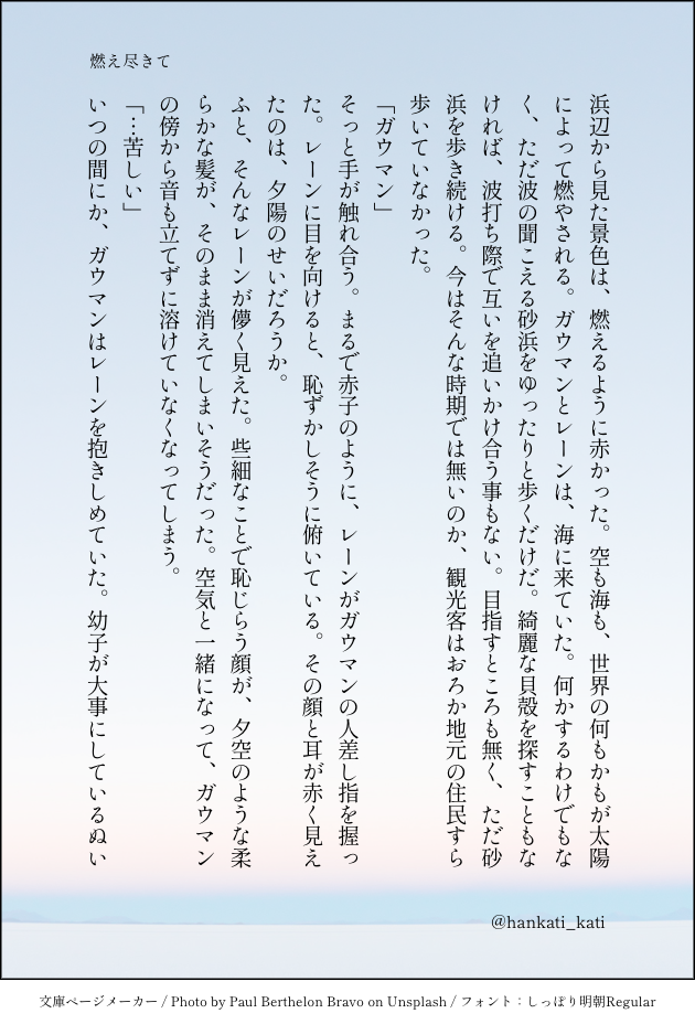 オパナピ置き場☆quiet followDONE海で散歩をするガウレンのお話です暗めの話を目指してみた……けど暗くなってるかな?? show all(+1 images) Tap to full screen (size:630x928).Repost is prohibited Let's send reactions! freqpopularsnackothersPayment processing Replies from the creator Follow creator you care about!☆quiet follow オパナピ置き場SPOILER⚠️種自由人間関係ネタバレあり なんでもいける人オル←イン、イングリットの妄想話です 1回目見た衝動で爆速で書いてしまったので、変なところあるかもしれない 小説とかまだ読んでない人が書いているため、ちょっとキャラクターに違和感感じるかもしれないです オパナピ置き場DONE先日配信ありましたね 自分の中で、初見時からいいんじゃね?となっていた二人、ヱリアノレと]ナの学パロR-18ssです 誰得 私得18歳以上ですか?↓ 4 オパナピ置き場MOURNING睡姦もえらぽちゃんガッツリはしてないけど、1歩手前まで行ってます一応18歳未満の方は見るのは控えてね オパナピ置き場DONE⚠️ネタバレ注意発動篇ラストあたりのラポーちゃんの話ですネットでイデについて調べてたら、モエラが迎えに来てないとかなんとか書いてあったので、ギリギリラポーちゃんは最後まで生きてたんじゃないかという妄想です 2 オパナピ置き場PAST⚠️腐向け朝から今日はかき氷の日と聞いて、かなり前に書いたジュドカミssを供養しますガソダムを知り、ジュドカミを知ってすぐ勢いのままに書いた文章のため、キャラ崩壊もあるかも……すみません…… 3 オパナピ置き場DONEとてもめちゃくちゃ大遅刻してしまいました………バレンタインのお話、cpはバニクリです………個人的な感想ですが、あっまあまの甘にしてやりました。 5 recommended works krt033DOODLE【R18】🧋ちゃん 2 TsuruDOODLE 2 李木子_rikikoDOODLE把好长时间以来搞过的涩涩(还能看的部分)给传一下 12 そらからぽいぽいDONE「雷虺虺(かみなりひかりひろめく)」【前編】我妻善逸くんのお誕生日によせた漫画です伊黒小芭内さんとの柱稽古が舞台全50頁予定の前編です(後編は伊黒小芭内誕生日に公開済→https://poipiku.com/2689763/9504936.html)※願望由来妄想ベース※心の広い方向け 24 シャキ菓子TRAINING2024.4.26 廃棄物処理業者MEMO2枚目カブトボーグ 2 頭ピンクDOODLE好きな攻めを思い浮かべてください。 KyugetsuDONEサッカー部 蹴戸 昌 2 ちゃびDONE🔞後天一時的女体化② 2