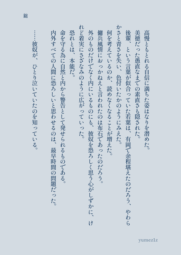 以前から、官兵衛のことを恐ろしく思いながら殺すことのできない秀吉という解釈が愚かしくて大好きだったんですが、殺せないのは葛藤しているからなのだという考えに目から鱗だったので、メモに眠ってた後輩ちゃんの変容と鎹となる一氏のあれやこれやと捏ねました。勢いしかない。