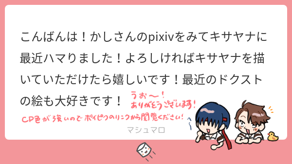 kashi_919☆quiet followDONE[マロリク.🎾]キサヤナpixivの作品を見てくださったとのことですが、その頃と私の絵柄が変わりすぎてて大丈夫かな…と不安ながらもお久しぶりに描きました。やっぱキサヤナは可愛いですね…🐤※淳くんのアイデンティティを忘れてたので描き足しました…記念に素手ver.も残しておきます…笑 show all(+3 images) Tap to full screen (size:600x337).Repost is prohibited Let's send reactions! freqpopularsnackothersPayment processing Replies from the creator Follow creator you care about!☆quiet follow kashi_919PROGRESSスプラ3 3周年おめでとう🎊発売から狂い、本を出し、まだ本を出しています♫このタイミングで出したかった本のラフと下書き🥹 2 kashi_919DOODLEジャージメイドスパイキー🩵 4 kashi_919MOURNING6月のスプケで出す予定だった本を断念したので、下書きまで終わっていた個人的に気に入っているページだけ供養します…🙏9月?かのスプケでは別の話を描く予定です💭 8 kashi_919DONEXで#リプきた作品の推しを描く タグでいただいた百鬼夜行シリーズの分を描きました。推しを描くはずが色々描きたくなって複数人います。。。 kashi_919DOODLE人間リハビリになぜか腐男塾。。。いつまでも大昔のメンツに固執しています。 kashi_919INFO初回頒布:3/1 横浜産業ホールマリネリア-スプラケット25ラ27-葉の箱通販BOOTH:https://kashi919.booth.pm/クロスフォリオ: https://xfolio.jp/portfolio/kashi_919/shop 11 recommended works ゆkりえTIRED #腐向け #伊庄 #年齢操作 せかいのDONE #腐向けHL時代にくっつきそうで結局くっつかなかった10年後ザレちゃんがHLを出る時にHLの記憶を全て消されて外の世界でただの会社員と流れの牙狩りとして再会して同棲して恋に落ちる話が私の頭の中で完結しました。楽しかったです。 3 千三百一DONEメモマメイカ(51)「オネガイ」https://raiot.net/i/1570352166305 そーまこーたCAN’T MAKEアニメがーアニメがー王様ー王様ーああああああああああああああああああ鬱っぽいの描いててなんですけど、幸せなキャスギルが描きたい soranin_honDOODLEおしり 〓DOODLEハニーービィ🐝 1104DONE腐向け。 ス腐ラトゥーン今日はスプラも久しぶりのフェスフェスで盛り上がってる中みんなにナイショでキスしよう。世界一ドキドキする優しくてかわいいキス はちまめTRAININGしののん 昼DOODLEかきたい… 2