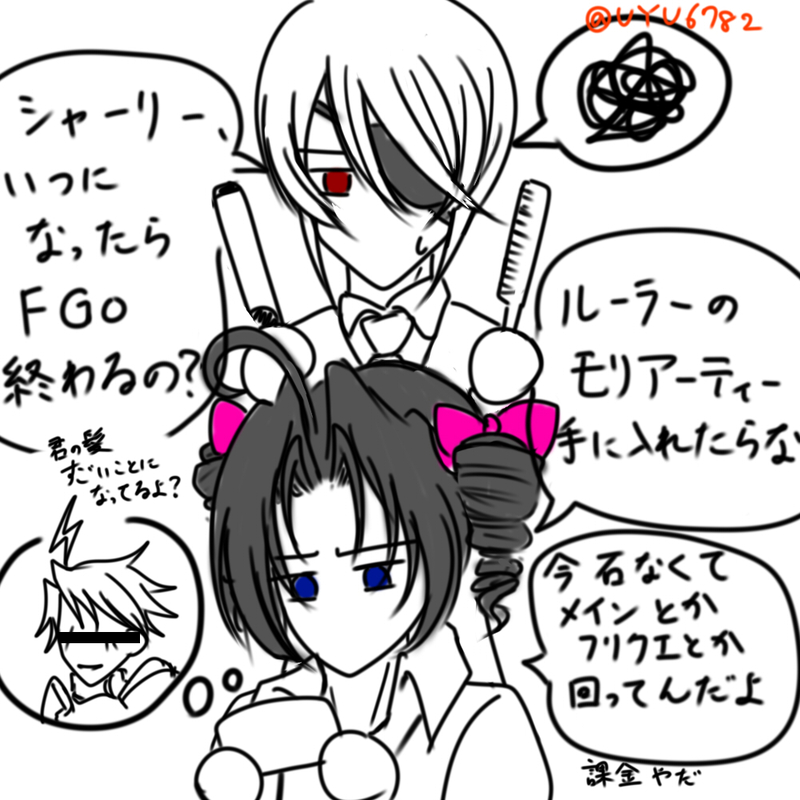 FGOで若い姿のモリアーティが実装されてこれは手に入れなきゃ!ってなって石かき集めてる時に描いた、異世界の教授入手に躍起になってるシャーリーとあまり構ってくれなくなったシャーリーに嫉妬して髪を弄るリアムたゃならくがき(シャーウィリ)