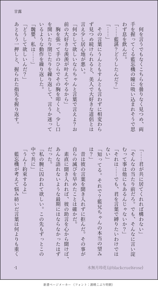 水無月玲花 @blackcruel6roseよろしくお願いいたしますฅ( ˘ω˘ )ฅ忘羨か高律のSSを備忘録的に乗せていくかと思います。 ☆quiet follow Yell with Emoji POIPOI 6