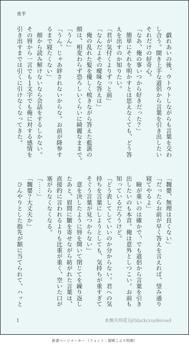 水無月玲花 @blackcruel6roseよろしくお願いいたしますฅ( ˘ω˘ )ฅ忘羨か高律のSSを備忘録的に乗せていくかと思います。 ☆quiet follow Yell with Emoji POIPOI 6