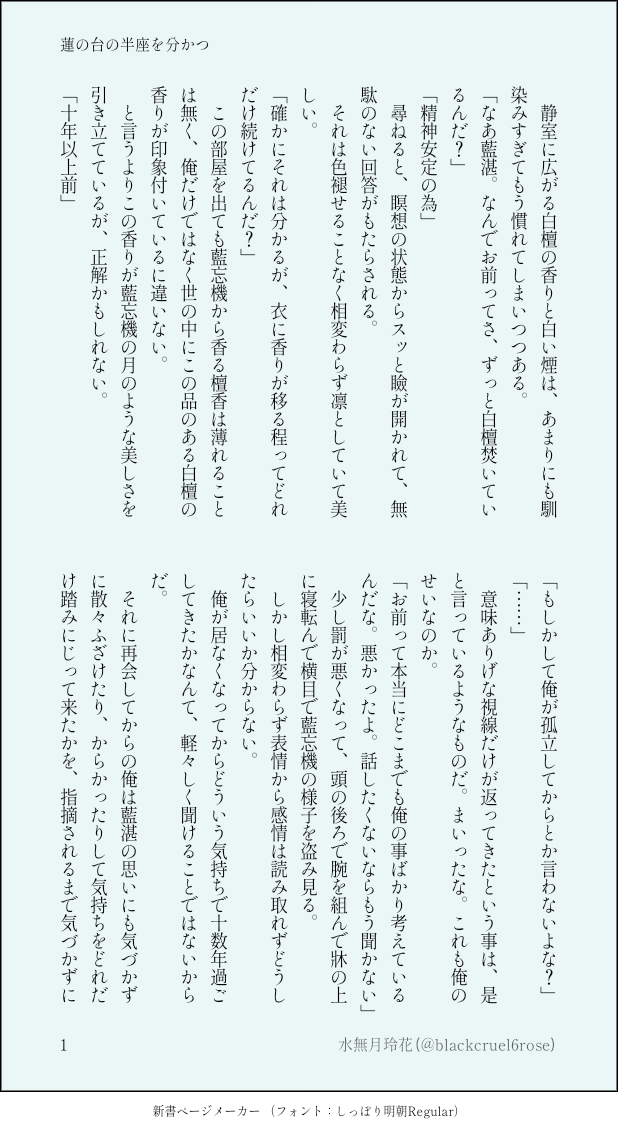 水無月玲花☆quiet followDONE忘羨ワンドロ。お題「匂い」より。原作軸。『蓮の台の半座を分かつ』 #魔道祖師 GrandmasterOfDemonicCultivation #MDZS #忘羨 WangXian show all(+2 images) Tap to full screen (size:618x1132).Repost is prohibited Let's send reactions! freqpopularsnackothersPayment processing Replies from the creator Follow creator you care about!☆quiet follow 水無月玲花DONE忘羨ワンドロ【筆跡】をお借りして書いたものです。原作軸道侶後。 4 水無月玲花DONE忘羨ワンドロ。お題「匂い」より。原作軸。『蓮の台の半座を分かつ』 3 水無月玲花DONE藍忘機お誕生日祝いのSSです( ⁎ᵕᴗᵕ⁎ )❤︎ 3 水無月玲花PAST忘羨ワンドロより『傘』原作軸SS 2 水無月玲花PAST忘羨ワンドロより「夜更かし」をお借りして書いたもの。原作軸のタイトルは『夜半』 2 水無月玲花PAST絵じゃありませんが忘羨ワンドロにあげたSSを留め置きます。お題「甘える」。原作軸小話『甘露』 2 related works jyaguchi_oekakiDONEヒッピーバンド藍湛とツーブロック魏嬰。服は多分ZARA 2 _92__ADONE天天🔞 え ちDONE『望現』2022.10.31魏嬰お誕生日おめでと〜!原作後番外編らへんのお話。誕生日の話ではないですが幸せを願って。 19 kd1ty4_ko_2MAIKINGNLでも描いたことなかった肌色系、描いてみたいと思わせる魔道祖師(忘羨)、恐るべし笑完成するかどうかは不明😂 西村ルルMOURNING書けないから供養。長い設定つき。現代AU、男子校パロ。魏嬰が藍湛の🍆を口にする描写があるので、R18にしています。乳首触ったとこから進まず、途中放棄してしまいました😂 1804 sayoloveloveDONE服脱いでそうゆう表現があるので閲覧は18歳以上の方でお願いします!お題【自分の色に染める】お借りしました。お互いの目の色が混じり合うの好きなのです。法力だかなんだかで混じりあっちゃったっていうのを描きたかったのですが・・・😂 hiomumu_00DOODLE忘羨ちゃん女体化です 5 tamayura830PAST子供江澄まとめ 4 しばた三歳DONE新婚忘羨ちょいすけべ。原作終了後、公に道侶となった2人と藍家のようすを妄想。魏嬰のイキの良さと藍湛の可愛らしさを表現したかった。初投稿どきどきしています。・アニメ/原作/陳情令の順で履修済・ハピエン至上主義・忘羨が好きすぎて爆発しそうになり、久しぶりに二次創作を書きました。どうぞ優しくして下さい… 18 recommended works inkmurmursDONEHanguang-Jun is so shameless!! ⁄(⁄ ⁄•⁄-⁄•⁄ ⁄)⁄ 2 名塚@natsuka0331PROGRESS陳情令の感想(書きかけ) ちょっとずつ書き足しますー陳情令ハチャメチャ面白かった!!! 名塚@natsuka0331DOODLEにょた魅魔魏嬰ちゃん2枚めは没った顔ありバージョン 2 mayo_animefanPROGRESS線画でーきた!!ちょっと時空が歪んでたので直した!!我ながら可愛く描けたと思う…😚😚 いそらDOODLE口の縦幅<<恵方巻き ななてん(七天/나나텐)DONE金凌お誕生日漫画 2022『あーりんは「おめでとう」って言われたい!!』 5 yuicyamaDOODLEユニバに行けるの楽しみすぎて も²@time1010thiefDOODLE紫蜘蛛と雲夢双傑 2 水戸海月🪼DOODLEお耳ぺろぺろ👂👅💦 2