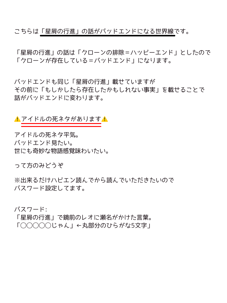 rikuto☆quiet followDOODLEこちらは「星屑の行進」https://poipiku.com/3342468/10084767.htmlの話がバッドエンドになる世界線です。最初の説明ページを読み「OK」って方のみパスワード入力してお読みください。 show hide show all(+32 images) Tap to full screen (size:768x1024).Repost is prohibited Let's send reactions! freqpopularsnackothersPayment processing Replies from the creator Follow creator you care about!☆quiet follow rikutoTRAINING月永/瀬名/ライハ/レオいず/いずレオお絵描き、らくがきを置くとこ。適当に追加される。配慮しないよ。許せる人だけどーぞ 20 rikutoDONEムルシャイ(肌色あるので背後気をつけてね) rikutoDOODLEこちらは「星屑の行進」https://poipiku.com/3342468/10084767.htmlの話がバッドエンドになる世界線です。最初の説明ページを読み「OK」って方のみパスワード入力してお読みください。 33 rikutoDOODLE「あんさんぶるSTARS」のストのネタバレを含むパロ、捏造話CP要素なし。話の主要メンバーはライハ(Knights)話の内容は重めですが一応ハッピーエンドです⚠️流血シーン等あるので苦手な方は注意⚠️バッドエンドの世界線はこちら↓https://poipiku.com/3342468/10084773.html 26