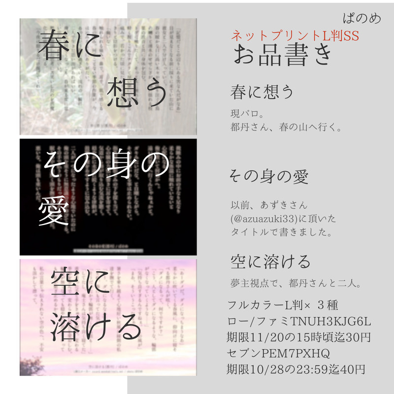 ぱのめ☆quiet followMENUtnオンリーL判フルカラーSSネップリ「春に想う(現パロ)」「その身の愛」「空に溶ける(現パロ)」ローソン番号TNUH3KJG6L(一枚30円、11/20の15時頃まで)セブン番号PEM7PXHQ(一枚40円、10/28の23:59まで) Tap to full screen (size:1080x1080).Repost is prohibited Let's send reactions! freqpopularsnackothersPayment processing Replies from the creator Follow creator you care about!☆quiet follow ぱのめDONE「アリコにリアコ」展示その5こちらは前回のarkオンリーイベント「ありったけのこの想い」でネップリ登録していた短編×3種の展示です。前回印刷してくださった皆さま、本当にありがとうございました!パスワードはイベント会場内のサークル🔮リンクをご覧ください 3 ぱのめDONE「アリコにリアコ」展示その43種類(クマバチ&人魚&ぬりかべ)の夢妄想観察日記?となっております??ゆるーくお楽しみ(お許し)いただけましたら幸いです……パスワードはイベント会場内のサークル🔮リンクをご覧ください! 3 ぱのめDONE「アリコにリアコ」展示その3発言まとめメーカーでアニメ&原作&妄想何でも詰め込んでます!!ゆるーい気持ちでご覧ください……パスワードは会場内のサークル🔮リンクに掲載中です! 4 ぱのめDONE「アリコにリアコ」展示その2原作読み直した後、発言まとめメーカーでark君の事をいろいろ妄想?感想?観察?してみました!パスワードはイベント会場内のサークル🔮リンクをご覧ください!! 4 ぱのめDONE「アリコにリアコ」展示その1書き下ろし現パロark夢短編×4種パスワードは「アリコにリアコ」イベント会場内のサークル🔮リンクをご覧ください!! 4 ぱのめDONE・2024/11/09「恋路の彼方に一波あり」イベント展示です・「幻のようなtn夢」と「歳を重ねた夢主のtn夢……?」の二つです・パスワードはイベント開催日を4桁で! 2 recommended works 宮城雪夜PAST #金カ夢 まとめ。一枚もカラーがないの今は後悔してる_(´ཀ`」 ∠)_夢主が似た顔なのは同じキャラが元になってるからです。絵よりも小話ばかり投げてた思い出。 18 岩味噌DONEsgmt夢 セリフなし #金カ夢疲れた夢主をネコちゃんみたいに甘やかしていたら変なスイッチ入って、夢主に覚悟させるsgmt「今日は、俺は猫だから」と言っている彼に甘えてると、下着を脱がそうとしてきたので拒むと、「猫だからわかんないや」と言われ… 3 みんみDOODLE■現パロ■推しの車でドライブデートしたいです!!!!! みんみDOODLE香水発売ありがとうございます!!!!!!!!!!!!!!結婚(購入)します!!!!!!!!!!!!!!!色変え差分あり。 4 あああ唯DOODLEとうとう描いてしまった宇佐美夢。※辛辣注意※一応後日ワンクッション入れました元は宇佐美の声素敵って文章打ってました(文字数関係で消しちゃった)賛否の否に偏りそうなものを描いたのにリアクション下さった方ありがとうございました嬉しい><。♥♥♥ 2 かえるPAST #金カ夢tksm夢12月17日オフラインイベントにて頒布予定の既刊「月島基×乳首開発(R)」のサンプリングです💖最高挿絵担当は所長の珈琲さん(@cafe_x41 )💖⚠牧場物語パロディ⚠獣人化⚠搾乳プレイ乳牛設定が月島基、夢主それぞれ付きます▶︎かえる作は夢主さんが乳牛です🐮🍼※pass「月島軍曹の誕生日半角数字4桁」 16 角砂糖REHABILI🎏が手を振り返してくれるだけ 氷輪(ひょうりん)DONE金カ夢 arkビニール傘の向こう側って不思議な風景ですよねパスワード🔑は1+1=? 1402 みんみDONE土方一派オンリーイベント「恋路の彼方に一波あり」開催おめでとうございます!2枚目はちょっと肌多めなので鍵かけてあります。パス→「役立たず」を辞書で調べると……?(カタカナ4文字) 2
