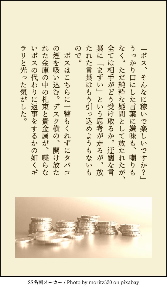 natuko5aug☆quiet followDONEじーてぃーえーオンラインの名無し主人公/部下モブのただの雰囲気文。140文字でお題ったーから「余計なことを言った」ってお題だったと思う。140字以内にはできませんでした主人公は一体なんのためにずっと大金を稼いでいるんだろうね、って話 Tap to full screen (size:550x950).Repost is prohibited Let's send reactions! freqpopularsnackothersPayment processing Replies from the creator Follow creator you care about!☆quiet follow natuko5augDOODLEじ〜てぃ〜え〜オンライン主人公イメージのSS。カラッとしてて開けたグランドセノーラあたりの地帯でドンパチやってそうだなという脳内妄想。 natuko5augPAST例のあれのssから台詞詰め込みした画像、なんと本など出ないのである!! natuko5augDONEじーてぃーえーオンラインの名無し主人公/部下モブのただの雰囲気文。140文字でお題ったーから「余計なことを言った」ってお題だったと思う。140字以内にはできませんでした主人公は一体なんのためにずっと大金を稼いでいるんだろうね、って話 natuko5augPAST熱中症で完全にダウンして外眺めてた時の思い出 natuko5augDONEオリジナル:「荒野、夜」的なワードでイメージしたやつです natuko5augDONEお題でいい感じの出た!作った!と勢いだけでやってたら「ゴルゴーン/ぐだ」ではなくなってしまっていた…供養です 2