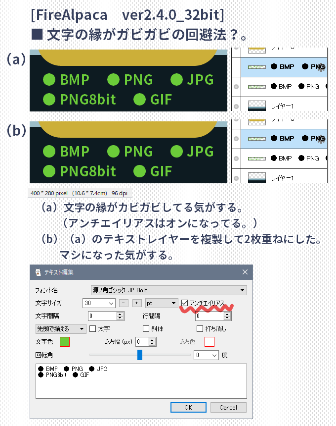 の。。☆quiet followMEMOFireAlpaca。文字の縁のガビり対策。2020年12月?のメモ。 Tap to full screen (size:680x860).Repost is prohibited Let's send reactions! freqpopularsnackothersPayment processing Replies from the creator Follow creator you care about!☆quiet follow の。。DOODLE250122。STブラシ。//250312a。ブラシ「20>1=堅<薄」。//250323f。STブラシ。 3 の。。DONE231128c。w200h84。さかな。 の。。MEMO231028。Qt版ってメニューからの「環境設定」が無い(実は、あった)のをいまさら知った。【ブラシセットのブラシ数を増やしたい】「config」フォルダの「np.cfg」ファイルをメモ帳で開いて「n30540=10」を「=20」にしたら増えた。が、実は、メニュー「設定」(「ヘルプ」の左横)→「ブラシセット」に「ブラシ数」があった。…あった!―――↓スクショ、64色GIF、122KB。 の。。DOODLE230708a。試しうp用。スクショ。元PNG:83KB→GIF:43KB。8bitPNG:31KB。 の。。PROGRESS230701d。いえ~い、途中経過。あと少し、なのか。スクショを、アズペで256→128色で、GIF保存した。 の。。MEMOFireAlpaca。「オーバーレイ」50%グレーは、RGB=128ってことでいいのかもしれない。230602c→230623。 recommended works 里上久路PROGRESS笹の葉ブラシ作ったこれで七夕の回のペン入れこわくない枝?はふちペンでちょっと葉が多いかな 里上久路PROGRESS縄ブラシ作成中まだ改良の余地がある…(朝から何してんだって) 里上久路PROGRESS縄ブラシまぁこれでいいんじゃないかと ぽてぽてDONER-18ペパアオ 毎回怪我して帰ってくるアオちゃにキレるペお仕置セッ とその後の甘やかし元ネタ提供:キムチの素さん素晴らしい壁打ちをイラスト化する許可をいただき、描かせていただきました😭❤️🔥元ネタからちょっとだけ変わっちゃってる所もありますごめんなさい💦💦 5 Getsu8BTRAINING色塗りの練習最近iPadでしかお絵描きしてなくて、iPhoneで描いてた時に、必死に色幅作りたくて編み出した自作ブラシの存在忘れてたや。久々に使うとなんかいい感じ hnwXZLrcUflr9wzPROGRESSぬいを抱っこしてるタイアカです線画作業終了 piyoman_pandaPAST手癖で描いた律っちゃんのゆるい詰め合わせ🖌️ 6 25tz_DONE6月のイベントで配布したかった無配の炭善ちゃんまたの名を⚪︎的な触れ合いが癖になった🎴くんまんが 3 墨をはくねこDONE海兵兄弟のお風呂話。海軍の浴場に衝立はないと思いつつ入れてる。 3