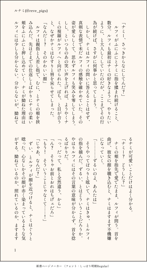 reve_pigu☆quiet followDONEルナミ「触れたいのはどちらか」自分だけドキドキしてるのが悔しい🍊の話 show all(+2 images) Tap to full screen (size:618x1132).Repost is prohibited Let's send reactions! freqpopularsnackothersPayment processing Replies from the creator Follow creator you care about!☆quiet follow reve_piguDONEこれまでにTwitterに上げていたルナミちゃんのSSをまとめたコピー本をネットプリントに登録しましたー!書き下ろしはないので、紙で読みたい方向けです。全てTwitterで読めるお話です。ネットプリントはセブンにて。A5 / 表紙込み24P / 全年齢 / 印刷代¥240予約番号:16361449印刷期限:3/11 23:59 2 reve_piguDONE大遅刻ですが、ルナミちゃんでいいおっぱいの日。焦らされ続けて胸イキしちゃうなみちゃんです。⚠︎とても短いです。18歳未満の方は閲覧禁止です。パスはoppaiの日の日付4桁 6 reve_piguDONEルナミ「背徳感に溺れるの」お付き合いしてるアオハルなルナミ。ほんのり雰囲気いかがわしいことしてます。 3 reve_piguDONEルナミ「恋華火」浴衣で夏祭りデートする話 3 reve_piguDONEルナミ「おとなとこども」前回上げたルナミの前日譚 4 reve_piguDONEルナミ「内緒の四文字」なみとおたまがお話してるだけ船長は出てきません 3