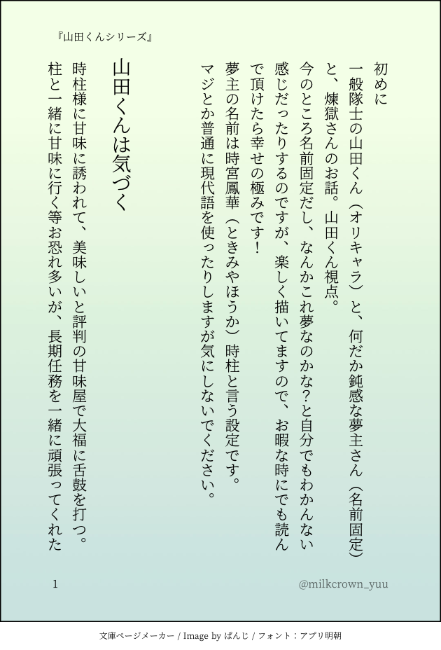 由羽。イラスト、漫画、小説、落書 @milkcrown_yuu 鬼滅の刃 煉獄杏寿郎の夢中心。イラスト、マンガ、小説とか色々描いてます。R18と書きかけの物はフォロワー様限定。スタンプとかRTとかめちゃくちゃ嬉しいです💕 ☆quiet follow Yell with Emoji Tap the Emoji to send POIPOI 30