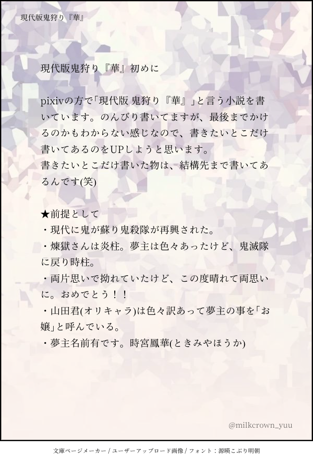 由羽。イラスト、漫画、小説、落書 @milkcrown_yuu 鬼滅の刃 煉獄杏寿郎の夢中心。イラスト、マンガ、小説とか色々描いてます。R18と書きかけの物はフォロワー様限定。スタンプとかRTとかめちゃくちゃ嬉しいです💕 ☆quiet follow Yell with Emoji Tap the Emoji to send POIPOI 30