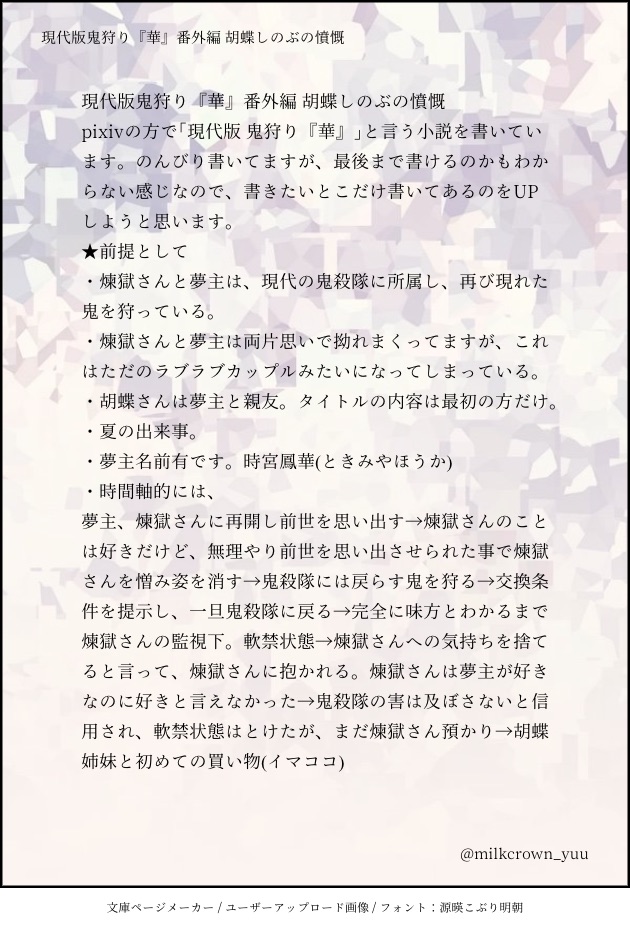 由羽。イラスト、漫画、小説、落書 @milkcrown_yuu 鬼滅の刃 煉獄杏寿郎の夢中心。イラスト、マンガ、小説とか色々描いてます。R18と書きかけの物はフォロワー様限定。スタンプとかRTとかめちゃくちゃ嬉しいです💕 ☆quiet follow Yell with Emoji Tap the Emoji to send POIPOI 30