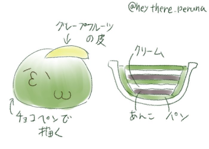 Twitterに投げたサマープディングの応用で作れそうなゴクリンケーキのイメージ図。黄色いピョンは黄桃とかでも良さそう。背中の◆は……どうしようw