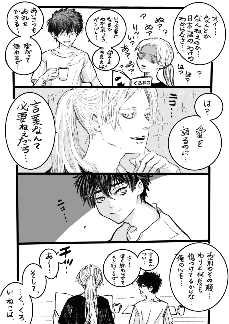 henka☆quiet followDOODLE渾身のキメ顔を持て余されるジャンジャックモンド唐突にちょけるので、頻繁にスン…とされがち Tap to full screen (size:2480x3508).Repost is prohibited Let's send reactions! freqpopularsnackothersPayment processing Replies from the creator Follow creator you care about!☆quiet follow henkaDOODLE格ゲーのアレ、カラーリングとかキャラが違う、もう1人の自分たちってやつ…プラチナブロンドには絶対褐色肌〜!!って描いたものの、本格的にどちら様です?感が凄いや…姿形は全然変えてないはずなのに、色の印象ってこんなに強いんだな〜あとなんかこのふたり、めちゃくちゃハチャメチャプレイを致してそうだな、と思いました… henkaDOODLEたまにえっちなやつに挑戦する気持ちが湧くけど、毎回やり慣れないことはするもんじゃないな…てなる…えっちなやつを描けるひとは本当に凄い!敬意しかない!!最中のユウチャン、🐺の髪の毛をぐしゃっと掴んで欲しい、あと全部ガン見して欲しい。 henkaDOODLE話しながらイチャつくの、 日常的に致してるふたり、て感じで好きだな〜ユウチャンのおっぱい、元気いっぱいに大きくしすぎた! henkaDOODLEあまりにまつ毛を増やしすぎたジャンジャックモンドの、まつ毛3割減を目指して練習 henkaDOODLEたま〜にこういうサプライズも起きる henkaDOODLE明け方の廊下で、わりと派手めの跡をつけた運動後で眠そうな推しとすれ違って、気まずそうな朝の挨拶をもらうモブになりたいな〜〜〜! recommended works 小雨澪TRAININGスマホで打ち込み始めたら、短いけど書けてしまった…。ふたりの甘さについて、20数年ぶりに改めて考えてみた。御神苗一人称JO、糖分過剰にご注意ください…。 1016 akiDONEジャンが初めておみの前で獣人化した時のジャンおみ小話 3827 TIKI_nakatobaDOODLEモブ隊員に夜のお誘いをされるおみと、それを撃退するジャンの話。わが家のジャンおみは仲良しのネコちゃんたち。※ジャンさんの女性相手の初体験の年齢や状況などを捏造しています。 4133 アゲハワークスDONEおみ大学生(19)原作ゴールドラッシュ前後のイメージ。ティアがティア。ジャンがちょっと冷たい…かも…?おみがとても子供っぽいです。https://poipiku.com/5727175/9208706.html続きのif 17457 kuki20220101DOODLEJ×OOパーツの回収/封印が終わってJ×Oがヤり始め、どこからともなくゆちゃの「あ…ジャ…あっ…」って声が聞こえ始めると緩む現場の空気…(スプ2人が警戒を解いている=暫くは安全らしい)という暗黙の了解が出来ている現場…初めて参加したメンバーはメチャ戸惑う現場…始まらないと緊張感が持続する現場…20220825 2 アゲハワークスMENUタイトル:少年は獣人の夢を見るか?【abod】2022/11/19発行予定の新刊になります。サンプルに冒頭11ページ、デートシーン1ページ、えろろシーン2ページを掲載いたしました。本文表紙込みでページ数142ページとなります。オマケ本12ページも付きます。価格に関しては、もう少し考えさせてください。予定では800円のつもりでいます。よろしくお願いします。 15 kuki20220101DOODLEあかむ社内で🎃仮装大会があって、ばったり遭遇するジャンおみ(←タイトル)…ゆちゃのフトモモが描けたから満足です…🤤ついでにJのケモミミとしっぽも🤤🤤🤤💕はっぴーはろうぃん🥰🎃20221031 kuki20220101MENU2022年11月19日(土) スプリガンオンリー Guardian Of Heritagewebに上げている諸々をまとめたweblog本です。本は🐯さんで。紙で欲しい方向け。サンプル?としてR18以外の全文を公開します。元がカラーのモノはこちらにあります→https://poipiku.com/4385895/イベント後に通販どうするか考えます。我ながらよぅ描いたわ… 52 アゲハワークスDONE2022/11/19発行【少年は獣人の夢を見るか?】のオマケ冊子ウェブR-18版になります。本編を読まないとわからないかと思うのでパス制となります。パスはモブリガン・アカシの下の名前の一文字目をアルファベットで二文字になります。例)ヒロシ・ノハラ→hi 14318