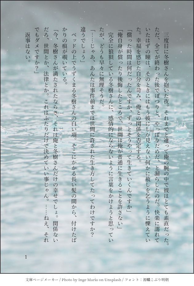 みたか☆quiet followTRAINING今山。文字です。今井くんもあやういかんじ…(2023.03.02) show all(+1 images) Tap to full screen (size:630x928).Repost is prohibited Let's send reactions! freqpopularsnackothersPayment processing Replies from the creator Follow creator you care about!☆quiet follow みたかDOODLEホウセンカのネタバレがあるタクシーのえです🦊と🦨 みたかTRAINING忘れられた、というか、忘れられていた、かも……拳研 479 みたかDOODLE今山、クリスマスの朝の話 1650 みたかDONE今山。作中の季節はいつでもいいように特に限定していません。 3656 みたかTRAINING「昼のベランダ」「結ばれる」「テレビ」#rendai今山です。今やってる大きな博物館の展示で絶対今井くんが関心なさそうなのを探すところから始めました……。それを話の内容と関連性をもたせるのが難しかった…… 6 みたかMOURNING受けのいまいくん(攻めはおりません)なんかちょっと失敗してしまったんですがもったいないので投げときます recommended works koubokin26TRAINING門キラ、140字。8/13〜9/12。順不同。お題はこちらからお借りしました。https://shindanmaker.com/28927 #rendai 31 koubokin26TRAINING門キラ、140字。9/13〜10/12。お題はこちらからお借りしました。https://shindanmaker.com/28927 #rendai最後2つはそれぞれ以下です。https://shindanmaker.com/375517https://shindanmaker.com/430183 32 koubokin26TRAINING門キラ、140字。10/13〜11/12。順不同。お題はこちらからお借りしました。https://shindanmaker.com/28927 #rendai最後1枚だけ二人とも性転換しています。 32 koubokin26TRAINING門キラ、140字。11/13〜12/12。順不同。お題はこちらからお借りしました。https://shindanmaker.com/28927 #rendai 30 koubokin26TRAINING門キラ、140字。4/13〜5/12。順不同。https://shindanmaker.com/28927 #rendai 30 koubokin26TRAINING門キラ、140字。5/13〜6/12。順不同。https://shindanmaker.com/28927 #rendai 31 koubokin26TRAINING門キラ、140字。6/13〜7/12。順不同。https://shindanmaker.com/28927 #rendai 30 koubokin26TRAINING門キラ、140字。7/13〜8/12。順不同。https://shindanmaker.com/28927#rendai 31 koubokin26TRAINING門キラ、140字。8/13〜9/12。順不同。https://shindanmaker.com/28927#rendai 31