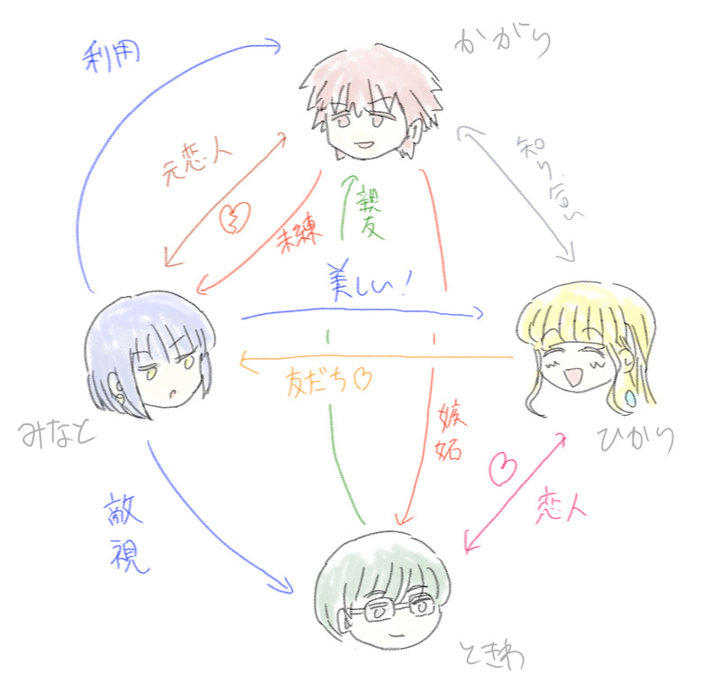 hikari_skrkw☆quiet followMEMOいま考えてるストーリー(仮)におけるキャラ相関図。はじめてつくったけど楽しい。このキャラたちはキャラありきでつくっていて特定のストーリーに属しているわけではない。ストーリーをつくるごとにそのつどの配役に当てはめていくつもり(藤子作品における小池さんのような)。 Tap to full screen (size:845x800).Repost is prohibited Let's send reactions! freqpopularsnackothersPayment processing Replies from the creator Follow creator you care about!☆quiet follow hikari_skrkwPROGRESSひかりちゃんが王の寵愛を受けて一時的に豪奢なアクセサリーをつけていた時期のスナップショットのラフ(素体そのままなのでワンクッション) hikari_skrkwPASTこれはむかし描いた二次創作イラストなのですが、部屋のレイアウトを考えるために色々と調べたりシミュレートしたりした思い出があり、いま現実の引っ越しを控えて同じようなことを考えているなあとふと思い出しました。 hikari_skrkwPROGRESSネーム11~12頁目。雑になってきた。 2 hikari_skrkwDOODLE村にいた頃の、まだ己の運命を自覚していないひかりちゃんのデザインを考えている。4世紀の日本が舞台なので髪は黒く染めている。基本的に農作業をして暮らしている設定。もはや誰だかわからないが、むしろそういうキャラとして独立させたい。本名はホノヒカリで、通称ヒカリ。漢文表記は火光王女。万葉仮名では穂乃比加里などと表記される。 hikari_skrkwPROGRESSスワンの絵にざっくり色をつけた。ここから波紋などを細かく描き込んでいけばいい感じになりそう。 hikari_skrkwDOODLE描きたいスワンの絵の鉛筆ラフ。水彩っぽくしたい。