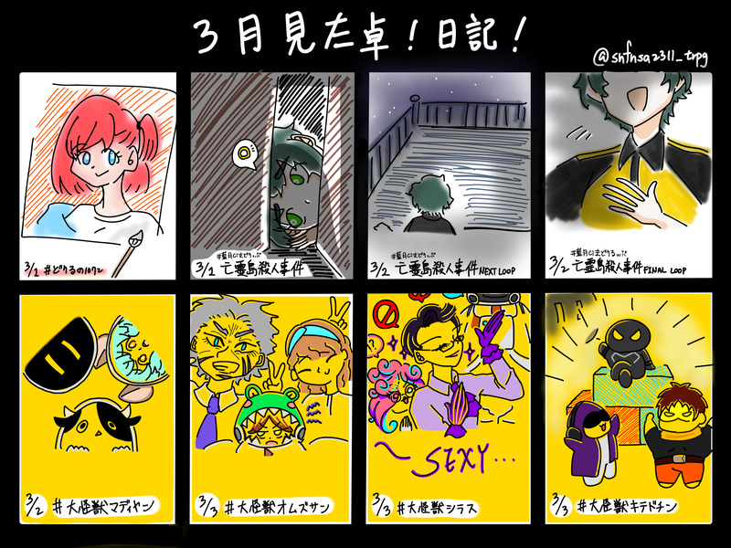 うらくゆら★TRPG☆quiet followDOODLETRPG FA+感想殴り書き|ネタバレなし最近たくさん昔のセッション拝見させていただいてて、どれも素敵だったのでせっかくだし絵日記にしよう!ということで3/1〜3/3見てた卓たちです。#どりるの1072 #藍月Ciまどりっぷ #大怪獣マディヤン #大怪獣オムズサン#大怪獣シラス #大怪獣キテドチン #TRPG show all(+1 images) Tap to full screen (size:2048x1536).Repost is prohibited Let's send reactions! freqpopularsnackothersPayment processing Replies from the creator Follow creator you care about!☆quiet follow うらくゆら★TRPGDOODLE東雲るりちゃんの戦闘用のアレのデザインやってみたよん#はるかな_02 うらくゆら★TRPGDOODLE大好きで誇らしいなVtuberとTRPG界隈の最推したち、意外と共同点ある!?のらくがきですどの垢に載せるかめちゃくちゃ惱んだ結果ポイピクにしたなんかひょったら消すかもしれん うらくゆら★TRPGSPOILER #どりおション介サヴァラン出題編・前編|FA|ネタバレあり※上記セッション、及びシナリオ《サラバ・サヴァラン・バランバラン》のネタバレが含まれます前編のここ好きまとめです後編も楽しみです! 7 うらくゆら★TRPGSPOILER #️⃣どりおション介サヴァラン 出題編・前編(1日目)を見ながら書いたメモです※《サラバ・サヴァラン・バランバラン》のシナリオネタバレが全面に含まれます1枚目はちゃんと整理してたつもりだが2枚目と3枚目結構読みづらいかもですでも書いてて楽しかったので放流とします参考でもなんでもしてくださ~い! 3 うらくゆら★TRPGSPOILER #たいそら02ことりくんの好きセリフ描きました鎧描けないの苦肉計の概念絵ですご注意くださいちょっぴり自我解釋もあります※シナリオ《太陽は夜空の色を知らない》のネタバレを含まれます うらくゆら★TRPGSPOILER自陣の好きシーン、クライマックス終了時くらい?ここハモったの嬉しかった※マダミス《アンノウン》のネタバレが含まれる可能性があります related works lima_cockcroftSPOILER #どりるの1072セッション内容バレ。妄想の産物。視聴済みの方のみどうぞ mo25_25SPOILERめちゃめちゃときめいた大好きなセッション #どりるの1072 ネタバレです 6 vieSPOILER #どりるの1072素晴らしいものを見てしまったので取り急ぎ描けるところを記録に残したかった 2 hatena___09SPOILER #どりるの1072 うらくゆら★TRPGDOODLETRPG FA+感想殴り書き|ネタバレなし最近たくさん昔のセッション拝見させていただいてて、どれも素敵だったのでせっかくだし絵日記にしよう!ということで3/1〜3/3見てた卓たちです。#どりるの1072 #藍月Ciまどりっぷ #大怪獣マディヤン #大怪獣オムズサン#大怪獣シラス #大怪獣キテドチン 2 recommended works ぽんずPASTレスおきぼっちは人から寄せられる好意が怖い というまんが根底で人間を信じているオキナエはきっとレスにも無償の愛を渡そうとするんだけど、一度絶望したレスにとってそれは毒にしかならない だから怯えるこの愛(毒)をどう扱うのか、今でも答えが出ないレスおき公式ではついぞそんな機会は来なかったけど、いつかこの毒を飲むとき、どんな反応するのか考えるとたのしーです(性格が悪い ぽんずDOODLEレス←←←←←←←←オキナエオキナエって蟲の血も混ざってるから、成人になるのが人間より早い設定にしてて、17、8ぐらいの外見だけど、精神的には10~12歳ぐらい。そんなこんなで、愛の駆け引きとか分かってないキャラなので、好きをどストレートに投げる愚鈍タイプです。友達の好きと恋人が使う好きが混ざっているイメージ。レスからしたら、勘弁してくれって感じだよね。という。 yome_firstDOODLEインセイン「楽園」石動 洸変なパンツ集めが趣味(セッション時はピンクのキ○ィさん総柄) 2 つぁんDONE都市伝説課の女 sankakubonjiriDOODLE(クトゥルフ)女性の三途静馬さんはモブに囲まれた時兵藤にかすかに助けを求めるのでは?という解像でモブ×にょたしじまさんという概念をじゃこさんに懺悔しに行った絵 水晴-MinaSe-DONE北条輝立ち絵まとめマギカロギア『クドリャフカの銀河紀行』『悪夢の唇、島の城』にてオンセデビューした北条の全立ち絵+魔剣コマです。一部軽く流血あり。 48 yamagumipSPOILER寝る前に聞いたら面白すぎて眠れなくなったwなんちゃってTRPGの歴史に残る名作の誕生だなぁ~。全員可愛らしい女性だし空気の読める方達みたいだからどうなるんだろうと見守っていたら、普通の設定も尖った設定もちゃんと面白可笑しくキャラに反映するから地獄のようなシーンが繰り広げられて笑い転げた。圧倒されながらもBLな2人を真剣に応援できて楽しかったし最高だった!素晴らしい奇跡をありがとう! 2 カウダMOURNINGとば嫁 げんみ❌おそらくみんな気になって、いやないかもしれないアレ。うちの神主だよ さんじゅうななDOODLEモ サ♀ 8
